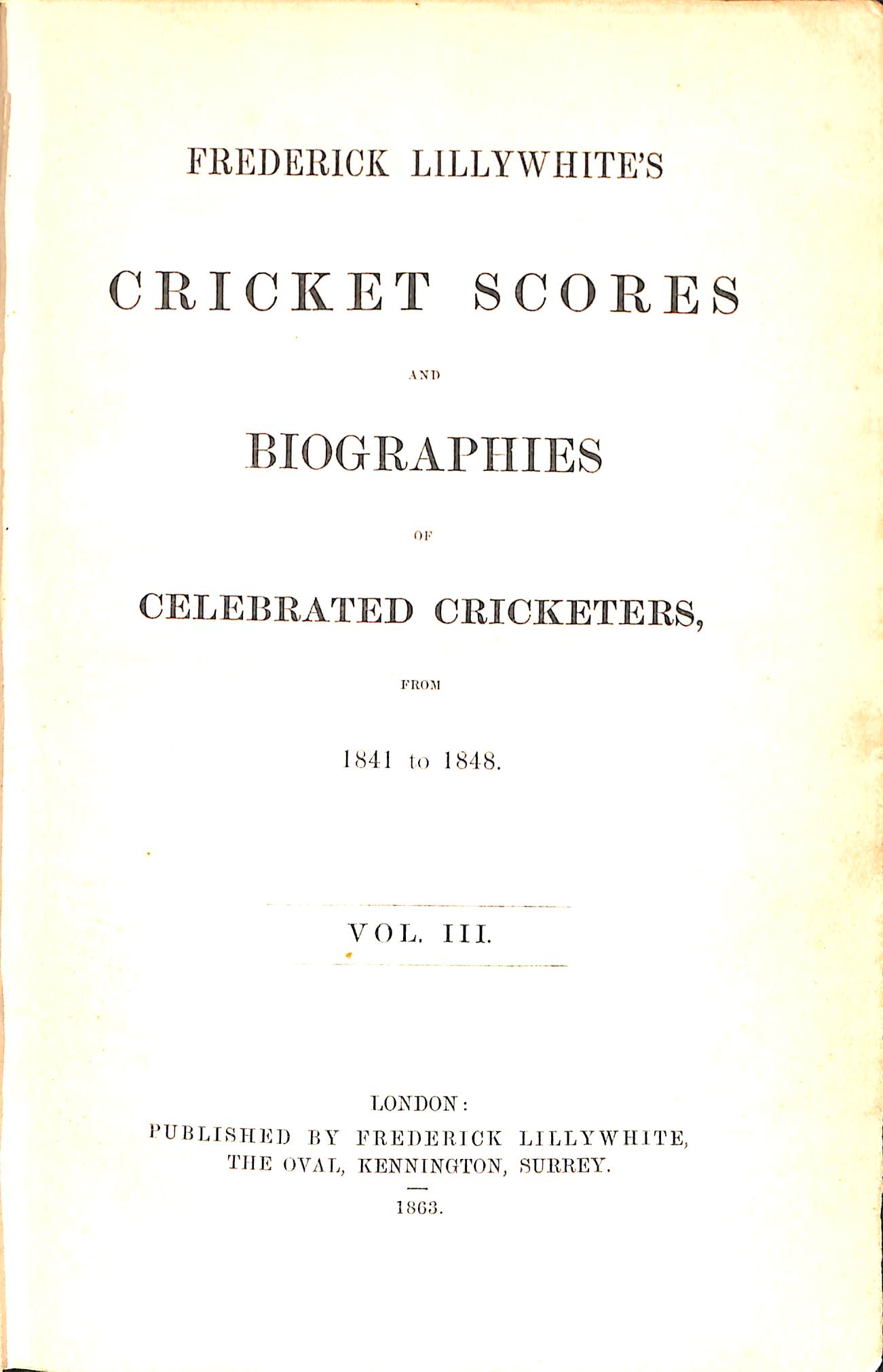 | Bibliog Item No: 17738 Padwick Volume I (second edition) 805 Category: biography; scores and/or statistics Examined by PDG | Frederick Lillywhite's cricket scores and biographies of celebrated cricketers from 1841 to 1848 Vol. III pub. 1863 by Frederick Lillywhite, London height: 22.5 cm; width: 14.5 cm. hardback xvi,688p., scores, index | ![]() |