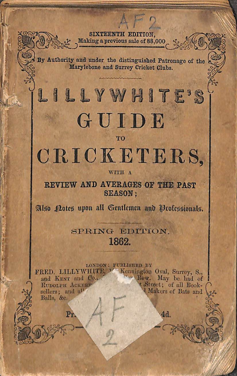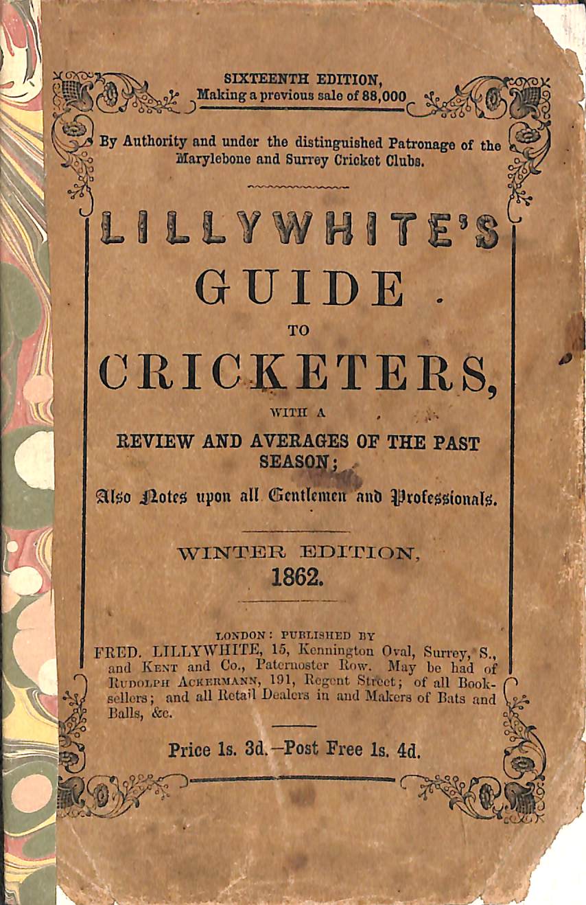 | Bibliog Item No: 18001 Padwick Volume I (second edition) 1086, 385 Category: annual Examined by PDG | Lillywhite's guide to cricketers 1862 Containing full directions for playing the noble and manly game of cricket Edited by Frederick Lillywhite pub. 1862 by Fred. Lillywhite, London and Kent and Co, London height: 15.5 cm; width: 10 cm. paperback (with spine) 104p., statistics Sixteenth edition "Winter edition" on cover | ![]() |