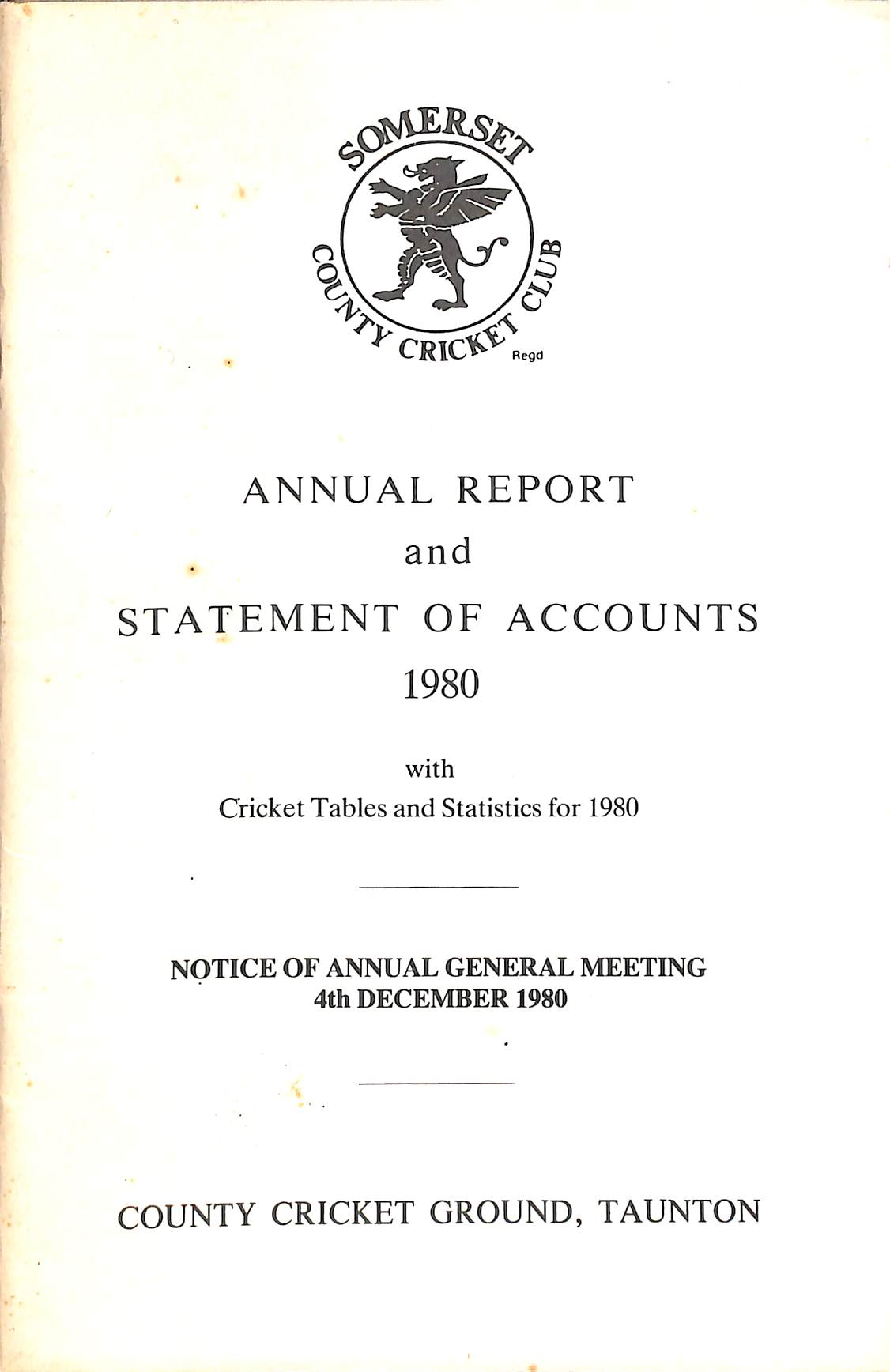 | Bibliog Item No: 18005 Padwick Volume II 1276 Category: annual Examined by PDG | Somerset County Cricket Club annual report and statement of accounts 1980 With cricket tables and statistics for 1980 pub. 1980 height: 21.5 cm; width: 14 cm. paperback (staple bound) 28p., statistics | ![]() |