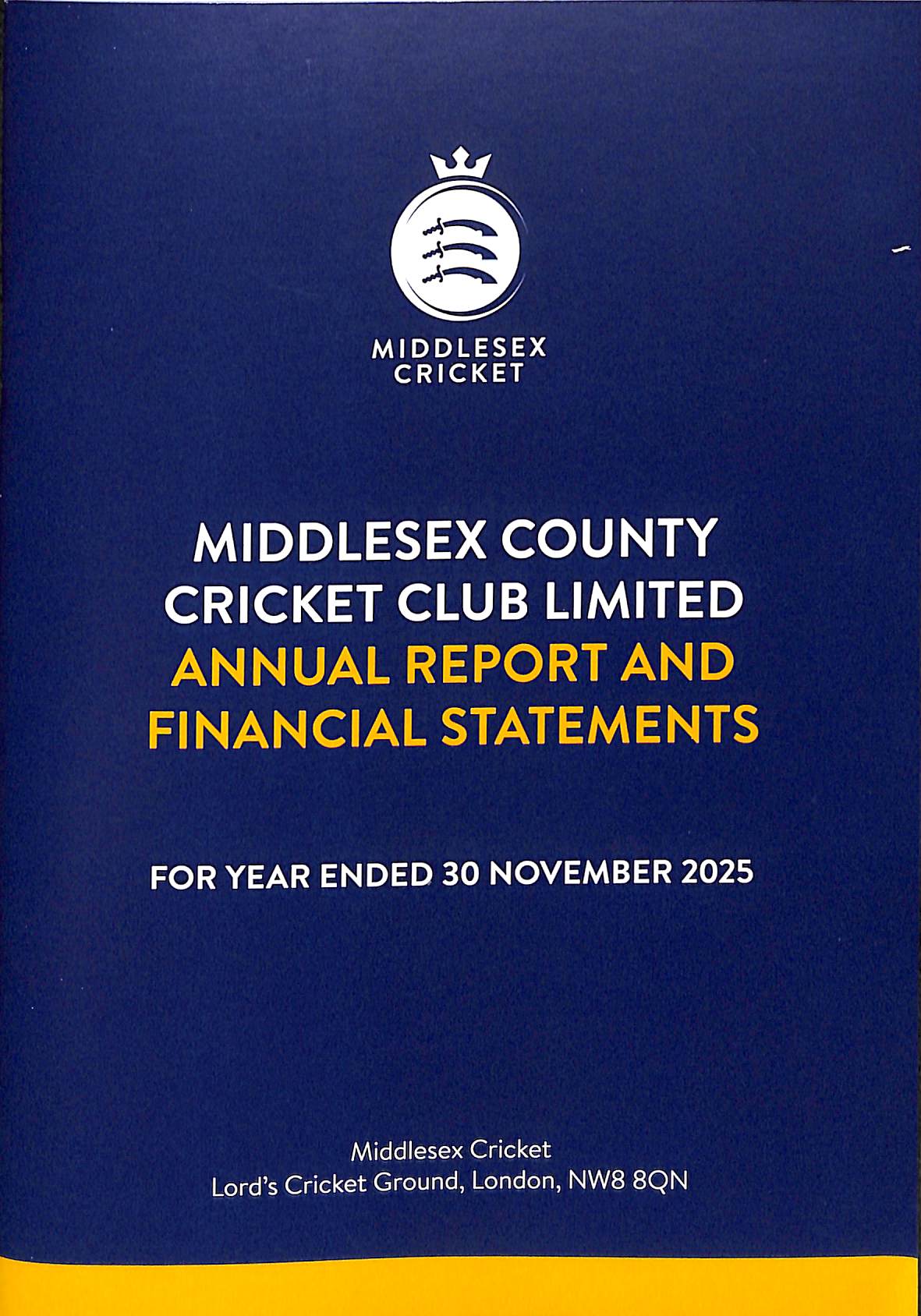 | Bibliog Item No: 18018 Category: annual Examined by PDG | Middlesex County Cricket Club Limited annual report and financial statements For the year ended 30 November 2025 pub. 2026 A5. paperback (with spine) [ii],34p. including covers, photographs | ![]() |