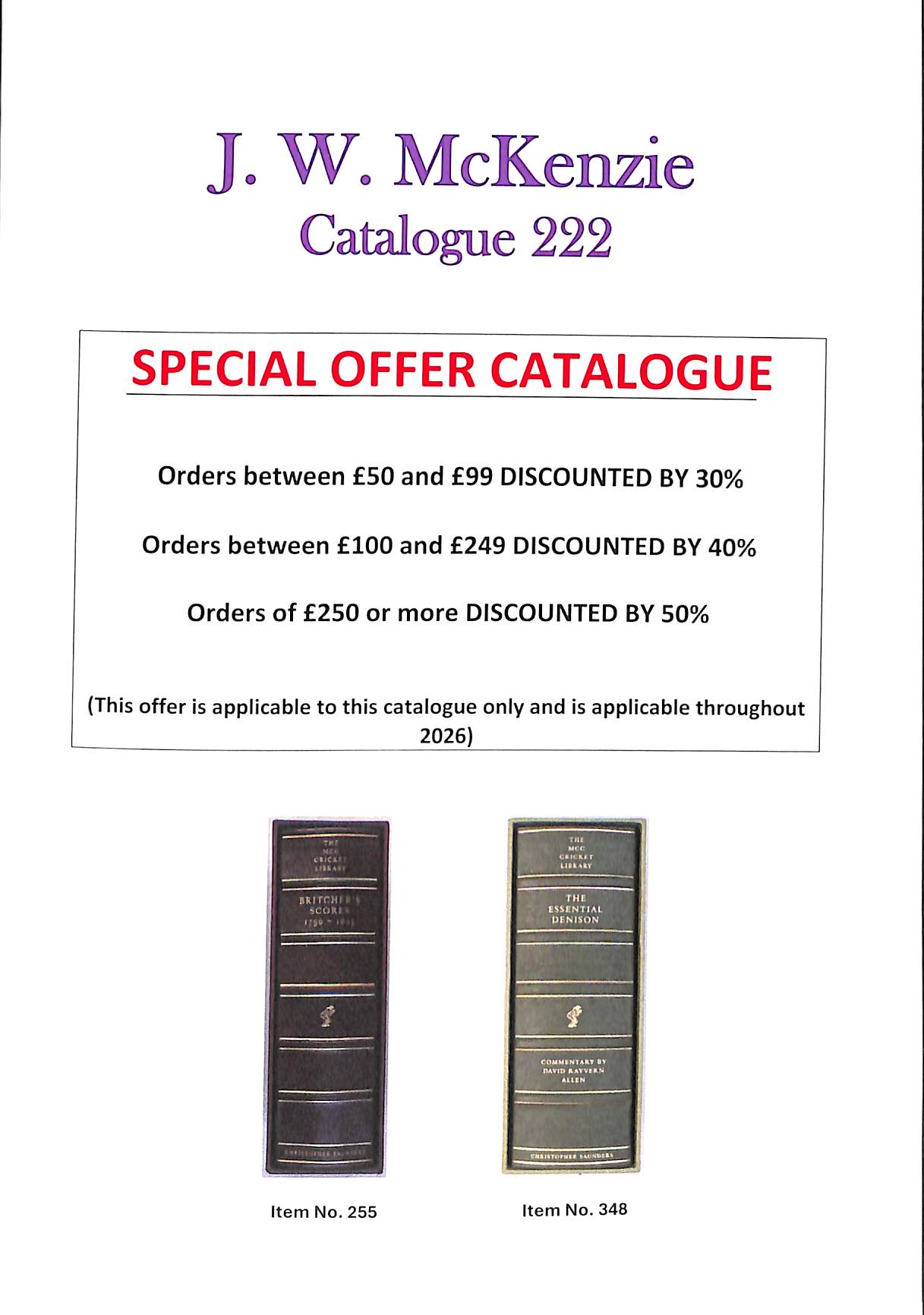 | Bibliog Item No: 9869 Category: catalogue Examined by PDG | A further list of selected items at special prices pub. 2003 by J.W. McKenzie, Ewell height: 22.5 cm; width: 14.5 cm. paperback (staple bound) [8]p. including covers Catalogue of items for sale Books (items 1-77) Wisden's Cricketers Almanack (items 78-86) | ![]() |