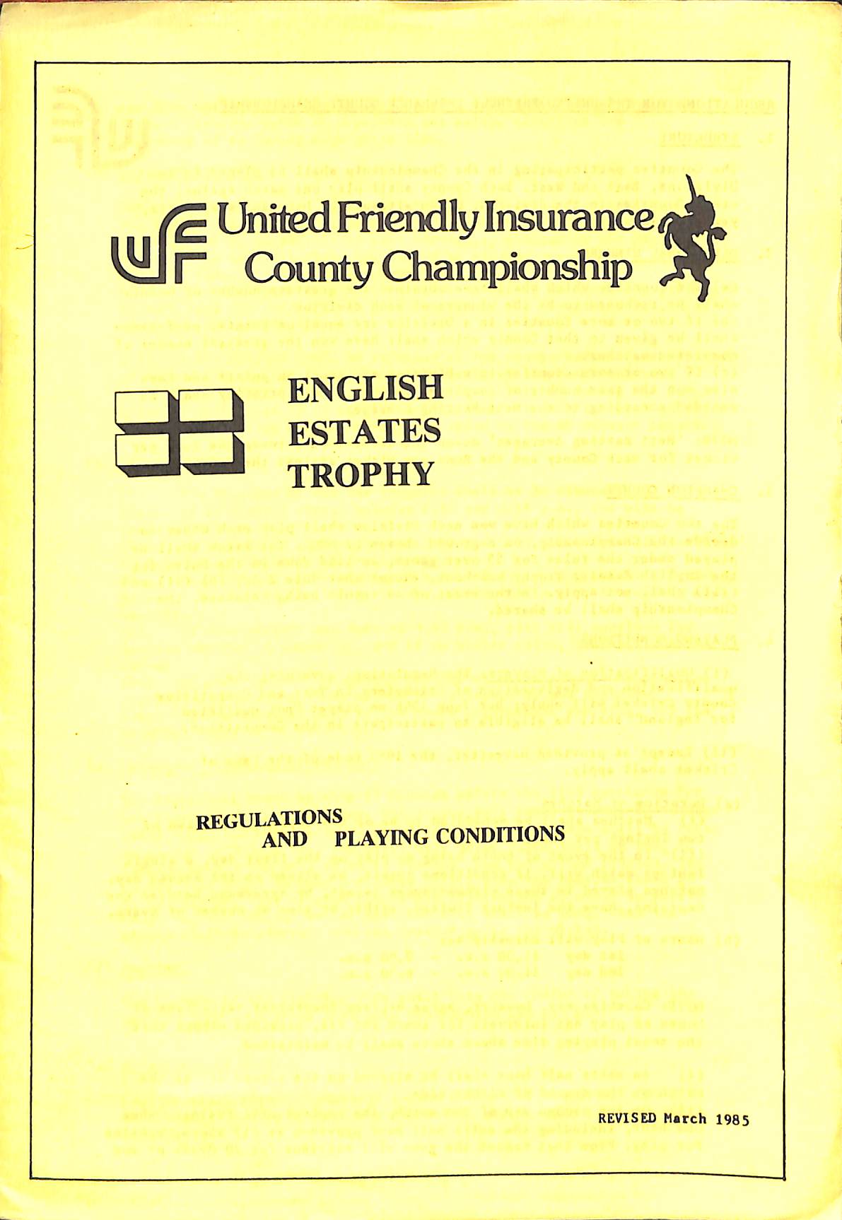 | Bibliog Item No: 18042 Category: event Examined by PDG | United Friendly Insurance County Championship and English Estates Trophy Regulations and playing conditions pub. 1985 by Minor Counties Cricket Association A5. paperback (with spine) 8p. including covers Revised March 1985 | ![]() |