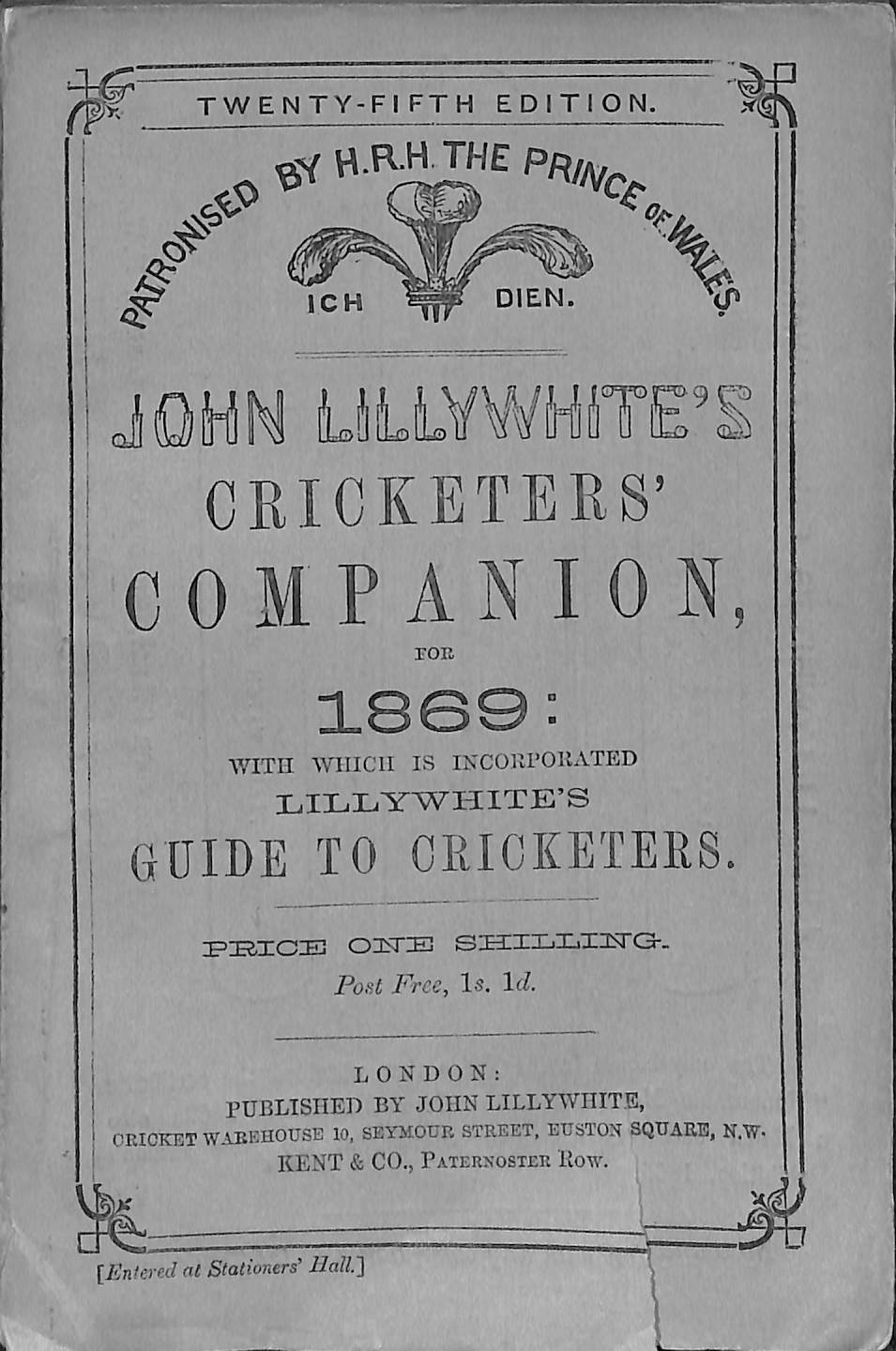 | Bibliog Item No: 17998 Padwick Volume I (second edition) 1088 Category: annual Examined by PDG | John Lillywhite's Cricketers' Companion for 1869 With which is incorporated Lilllywhite's Guide to Cricketers Compiled and edited by John Lillywhite pub. 1869 by John Lillywhite, London height: 17.5 cm; width: 11.5 cm. paperback (with spine) 147p., diagrams, scores, statistics Twenty-fifth edition | ![]() |