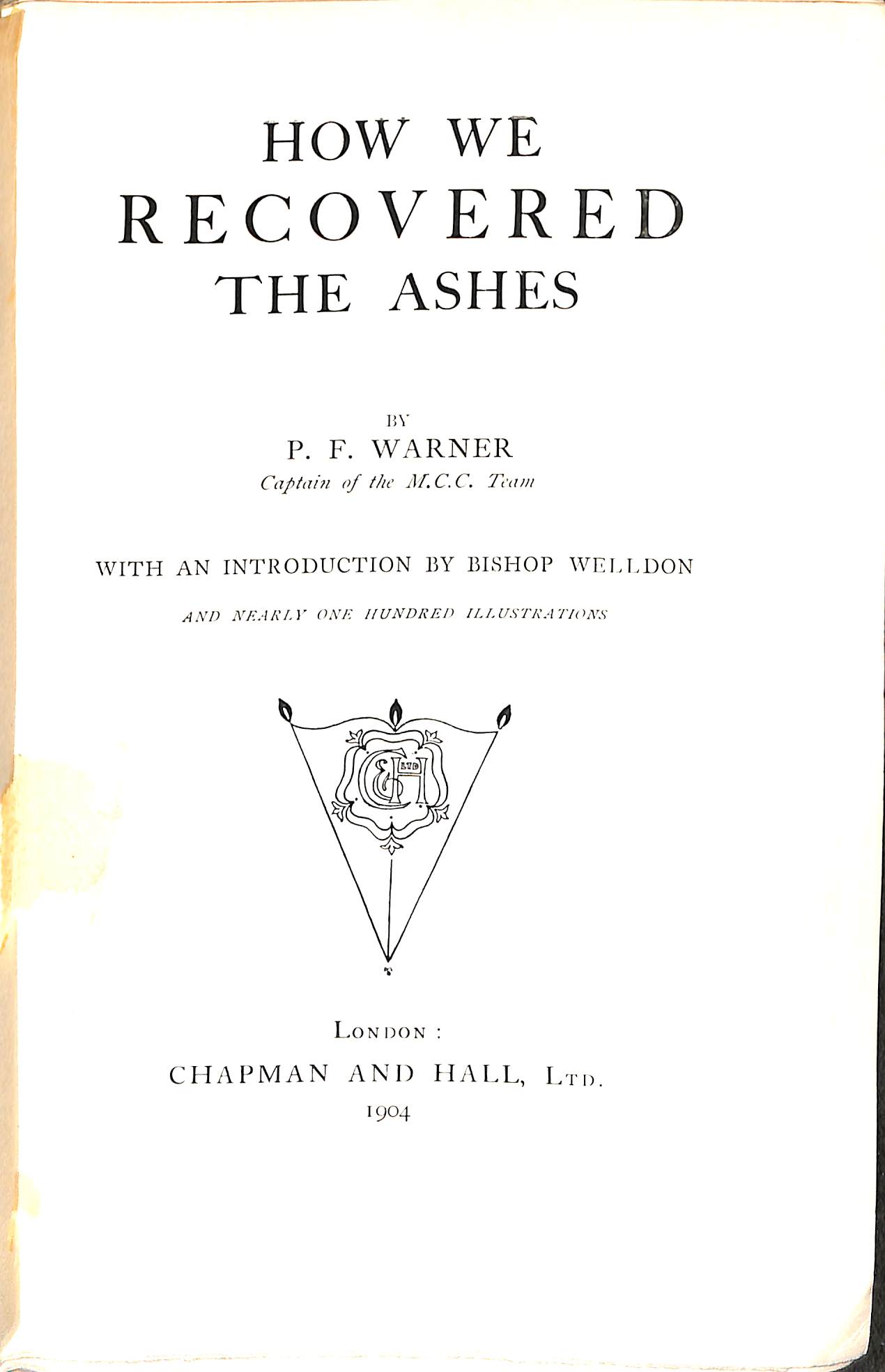 | Bibliog Item No: 17976 Padwick Volume I (second edition) 4434 Category: tour Examined by PDG | How we recovered the Ashes Author: P. F. Warner pub. 1904 by Chapman and Hall, Ltd, London height: 23 cm; width: 14.5 cm. hardback xxix,340p., photographs, scores, statistics | ![]() |