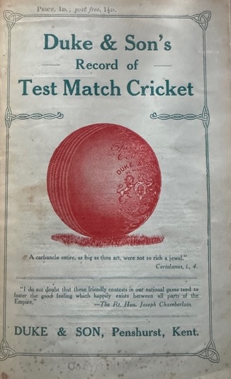 | Bibliog Item No: 17908 Padwick Volume I (second edition) 4333 Category: scores and/or statistics Examined by MC | Duke & Son's record of Test match cricket Author: F. S. Ashley-Cooper pub. 1912 by Duke & Son, Penshurst height: 18 cm; width: 12.5 cm. paperback (staple bound) 24p, statistics | ![]() |