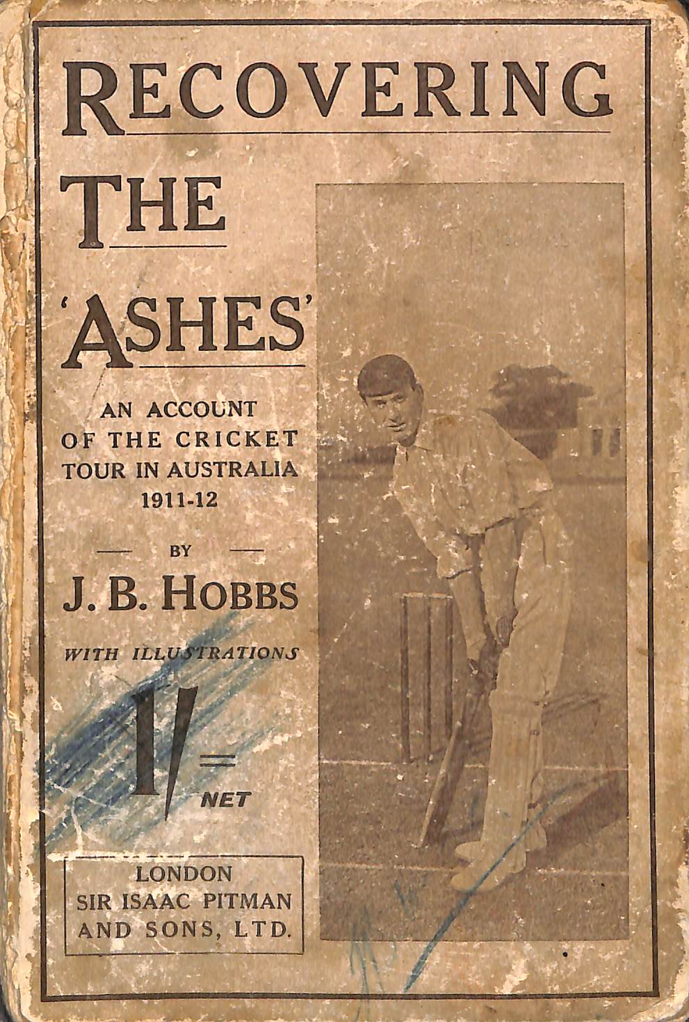 | Bibliog Item No: 17942 Padwick Volume I (second edition) 4440 Category: tour Examined by PDG | Recovering the "Ashes" An account of the cricket tour in Australia 1911-12 Author: J.B.Hobbs pub. 1912 by Sir Isaac isticPit man & Sons, Ltd, London height: 18 cm; width: 12 cm. hardback iv,146p., photographs, scores, statistics | ![]() |