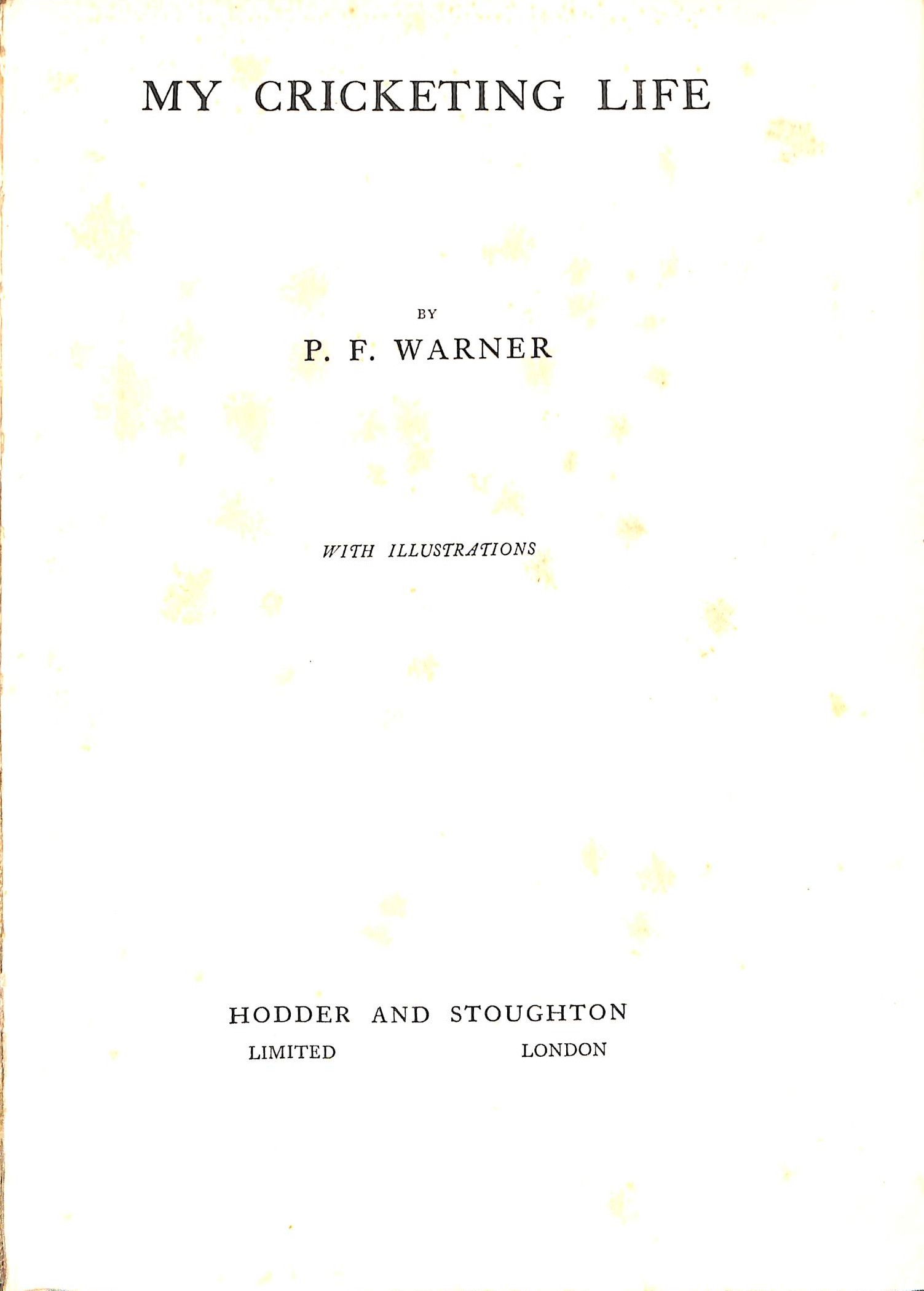 | Bibliog Item No: 17950 Padwick Volume I (second edition) 8202 Category: biography Examined by PDG | My cricketing life Author: P. F. Warner pub. 1921 by Hodder and Stoughton, London height: 23 cm; width: 16.5 cm. hardback xi,336p., photographs, statistics, index Limited edition of 200 signed and numbered copies | ![]() |