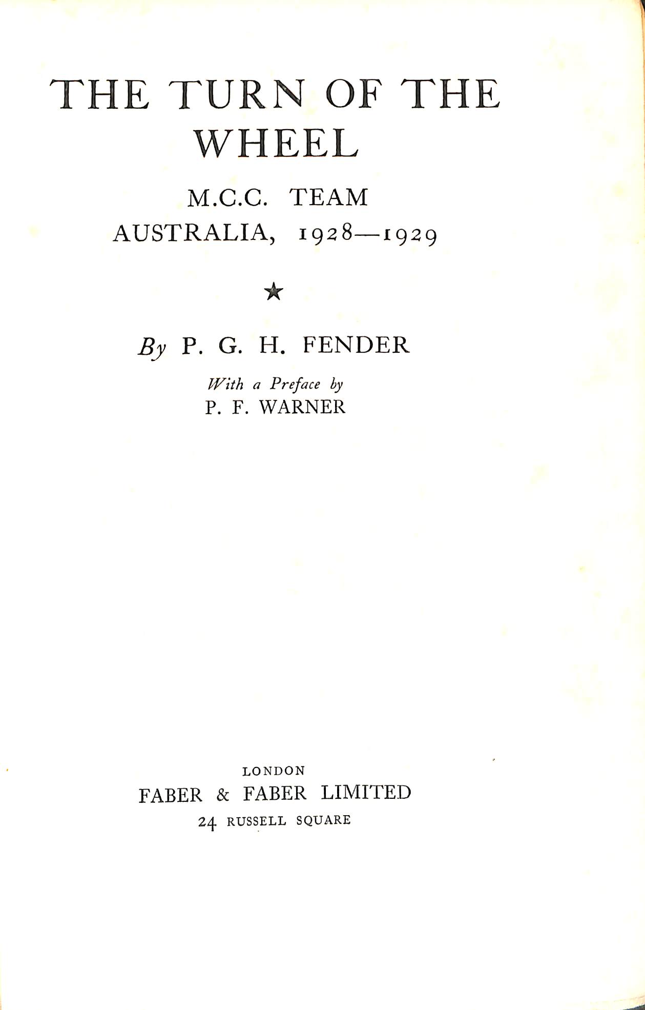 | Bibliog Item No: 17977 Padwick Volume I (second edition) 4456 Category: tour Examined by PDG | The turn the wheel M.C.C. team Australia, 1928-1929 Author: P. G. H. Fender pub. 1929 by Faber & Faber Limited, London height: 23.5 cm; width: 24.5 cm. hardback 384p., photographs, scores, statistics Preface by P.F.Warner | ![]() |