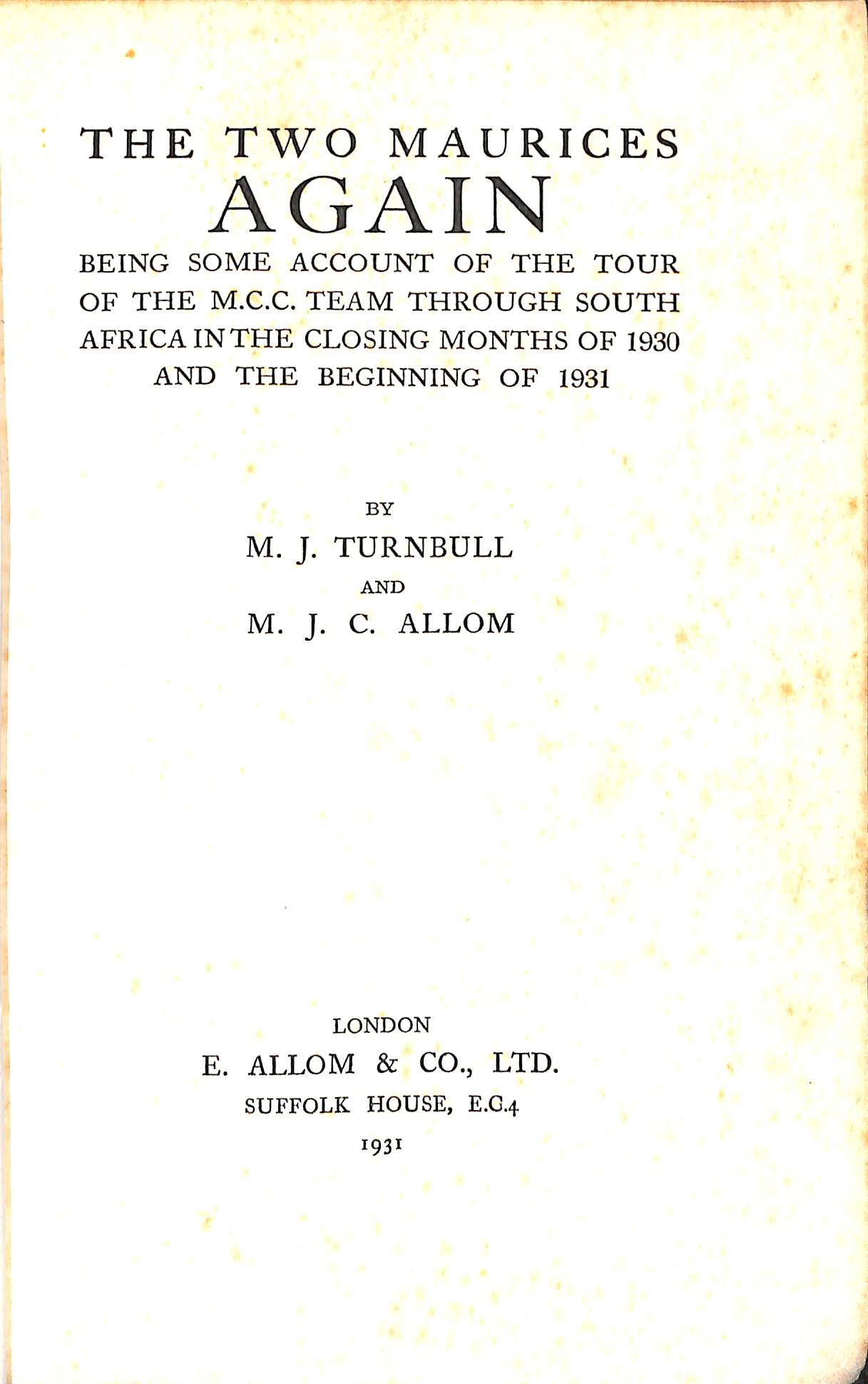 | Bibliog Item No: 17975 Padwick Volume I (second edition) 4637 Category: tour Examined by PDG | The two Maurices again Being some account of the tour of the M.C.C. team through South Africa in the closing months of 1930 and the beginning of 1931 Author: M. J. Turnbull and M. J. C. Allom pub. 1931 by E. Allom & Co., Ltd, London height: 22 cm; width: 14 cm. hardback 256p., photographs, scores, statistics | ![]() |