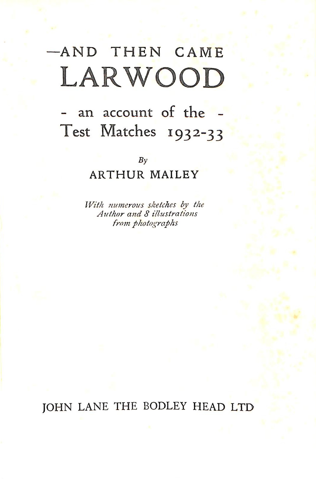 | Bibliog Item No: 17940 Padwick Volume I (second edition) 4481 Category: tour Examined by PDG | ... And then came Larwood An account of the Test Matches 1932-33 Author: Arthur Mailey pub. 1933 by John Lane The Bodley Head Ltd, London height: 18.5 cm; width: 12.5 cm. hardback [viii],244p., photographs, scores, statistics | ![]() |