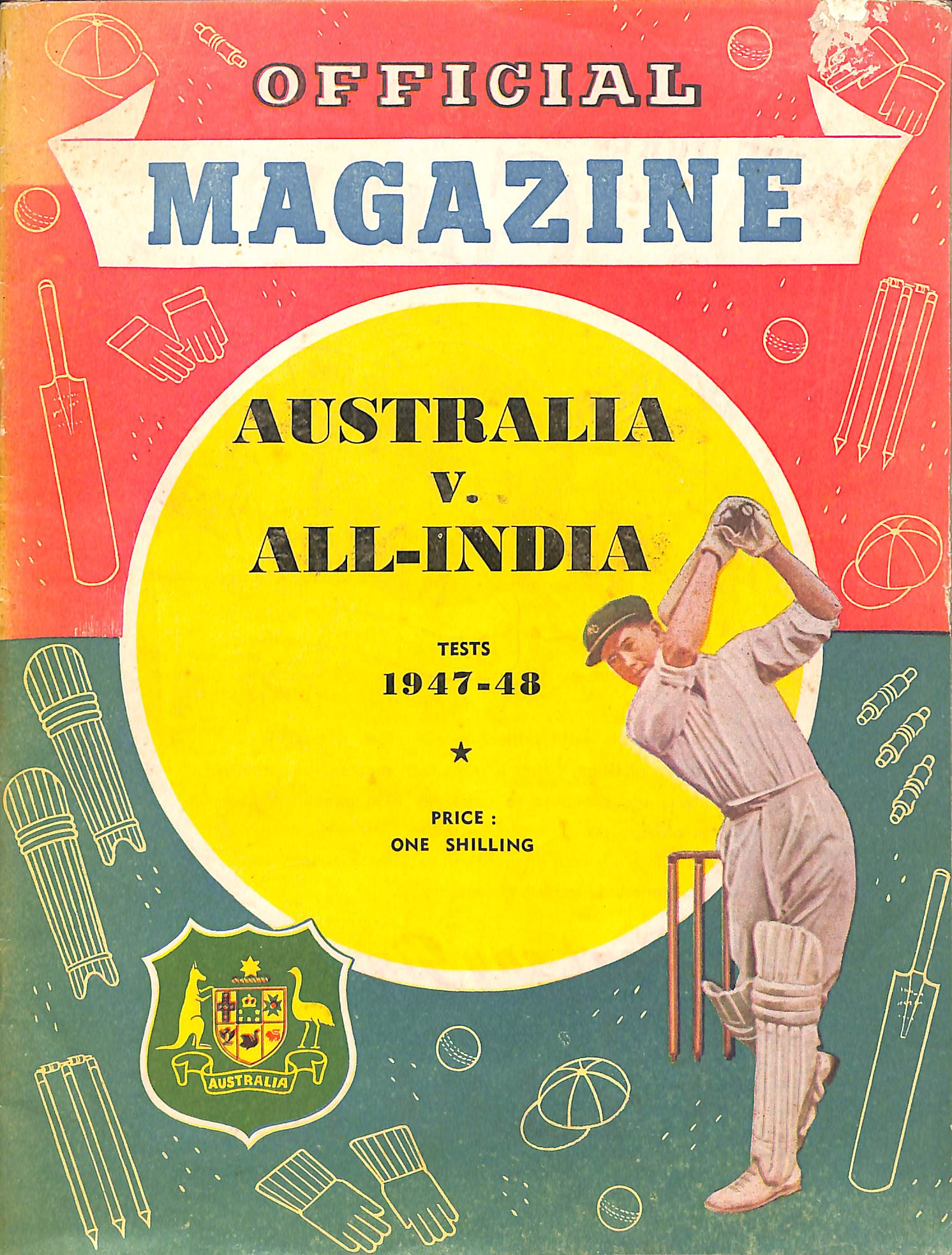 | Bibliog Item No: 17921 Padwick Volume I (second edition) 5632-1 Category: tour brochure Examined by PDG | Official magazine Australia v. All-India Tests 1947-48 pub. 1947 by Queensland Publications, Brisbane height: 24.5 cm; width: 19 cm. paperback (staple bound) 40p. including covers, photographs, statistics pre-tour | ![]() |