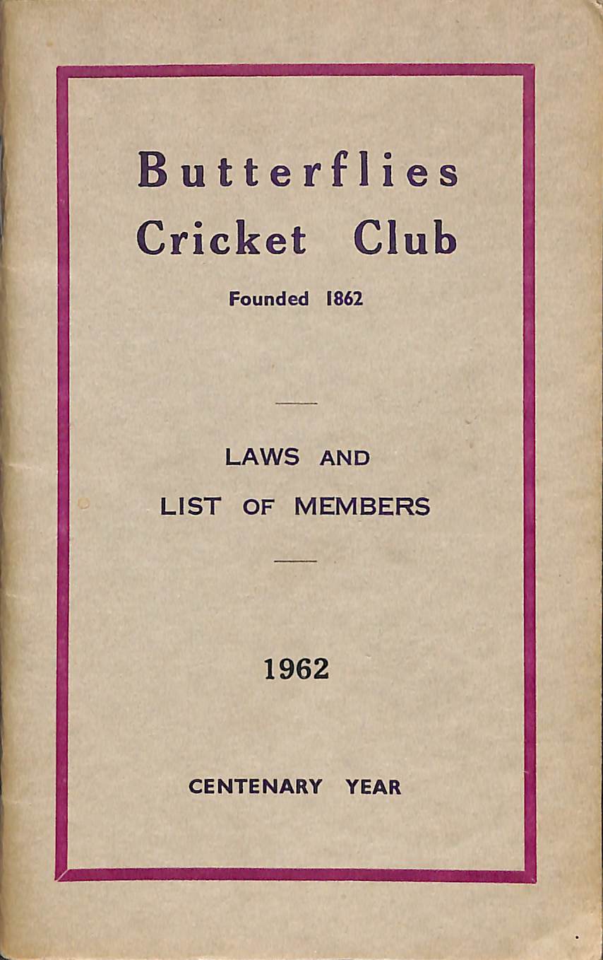 | Bibliog Item No: 17286 Category: annual Examined by PDG | Butterflies Cricket Club laws and list of members 1962 pub. 1962 by Butterflies Cricket Club height: 17 cm; width: 10.5 cm. paperback (staple bound) 50p. | ![]() |