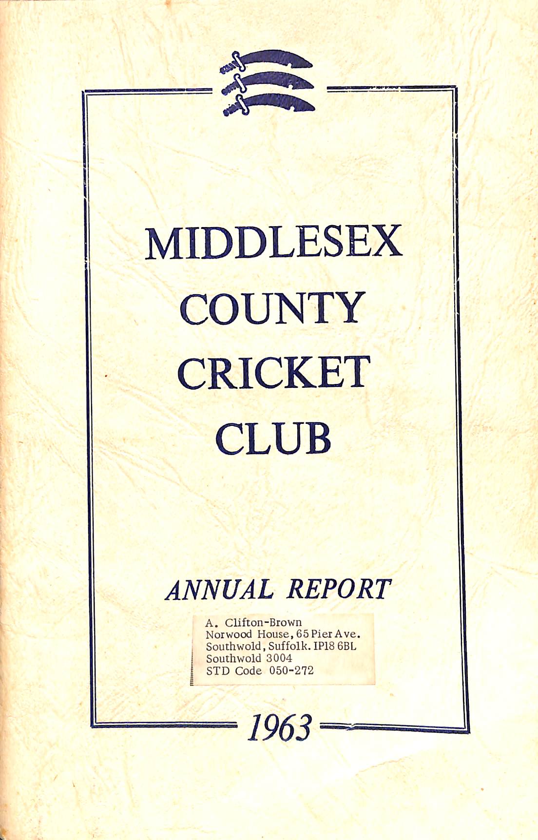 | Bibliog Item No: 17825 Padwick Volume I (second edition) 2414 Category: annual Examined by PDG | Middlesex County Cricket Club annual report and statement of accounts 1963 pub. 1964 height: 21.5 cm; width: 13.5 cm. paperback (staple bound) [ii],30p., photographs, statistics | ![]() |
