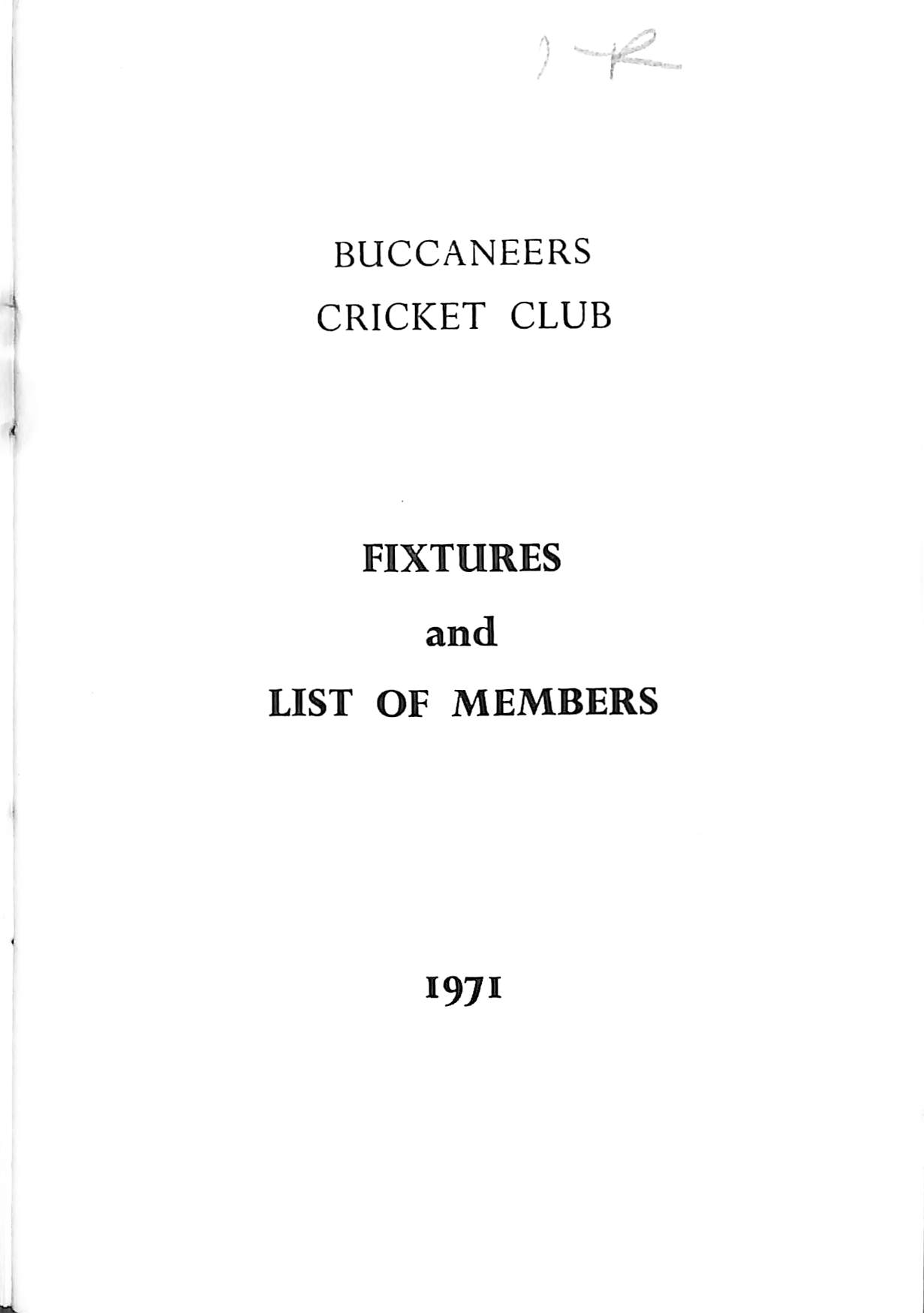 | Bibliog Item No: 17280 Padwick Volume I (second edition) 1246 Category: annual Examined by PDG | Buccaneers Cricket Club fixtures and list of members 1971 pub. 1971 height: 14.5 cm; width: 10 cm. paperback (staple bound) 19p. | ![]() |