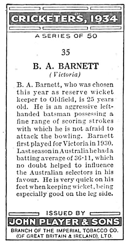 BA Barnett card number 35 of 50 of the Cricketers, 1934 set published by John Player & Sons 1934 |