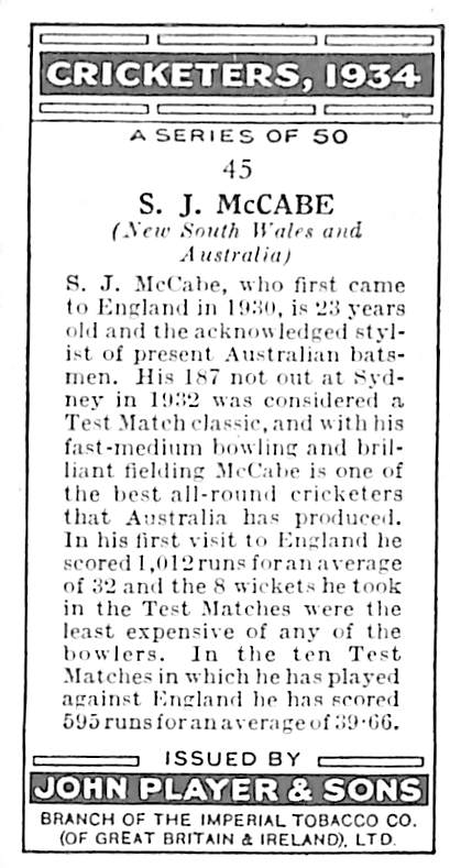 SH McCabe card number 45 of 50 of the Cricketers, 1934 set published by John Player & Sons 1934 |