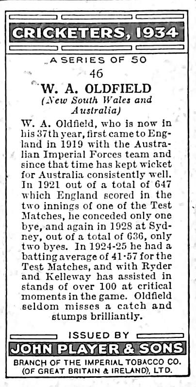 WA Oldfield card number 46 of 50 of the Cricketers, 1934 set published by John Player & Sons 1934 |