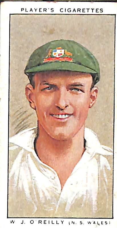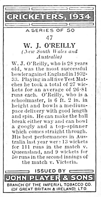 WJ O'Reilly card number 47 of 50 of the Cricketers, 1934 set published by John Player & Sons 1934 |