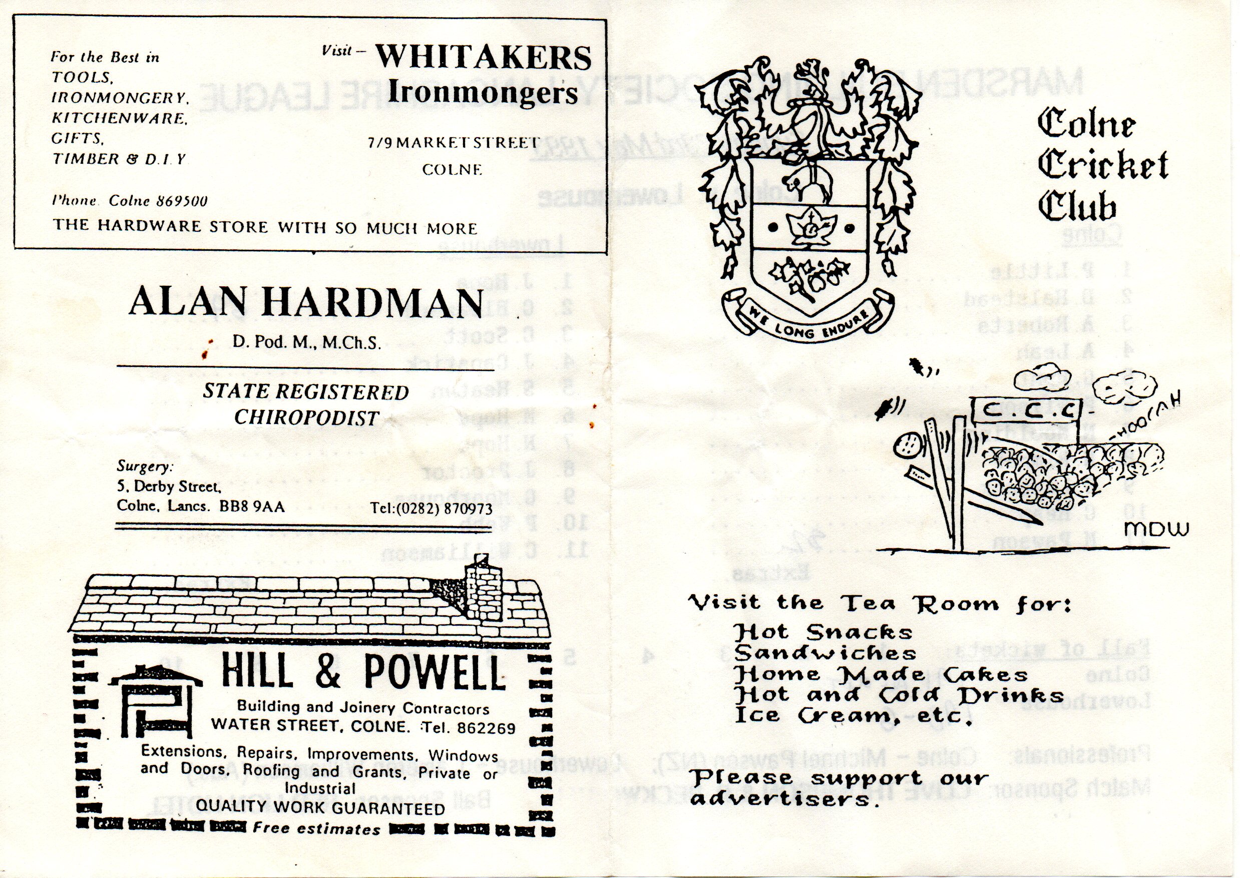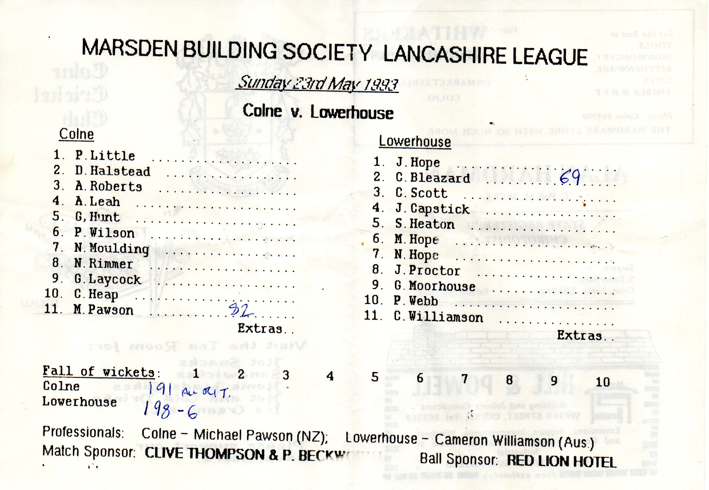 Colne v Lowerhouse Lancashire League At Colne Cricket Club On 23rd May 1993 pre-match scorecard with written updates |