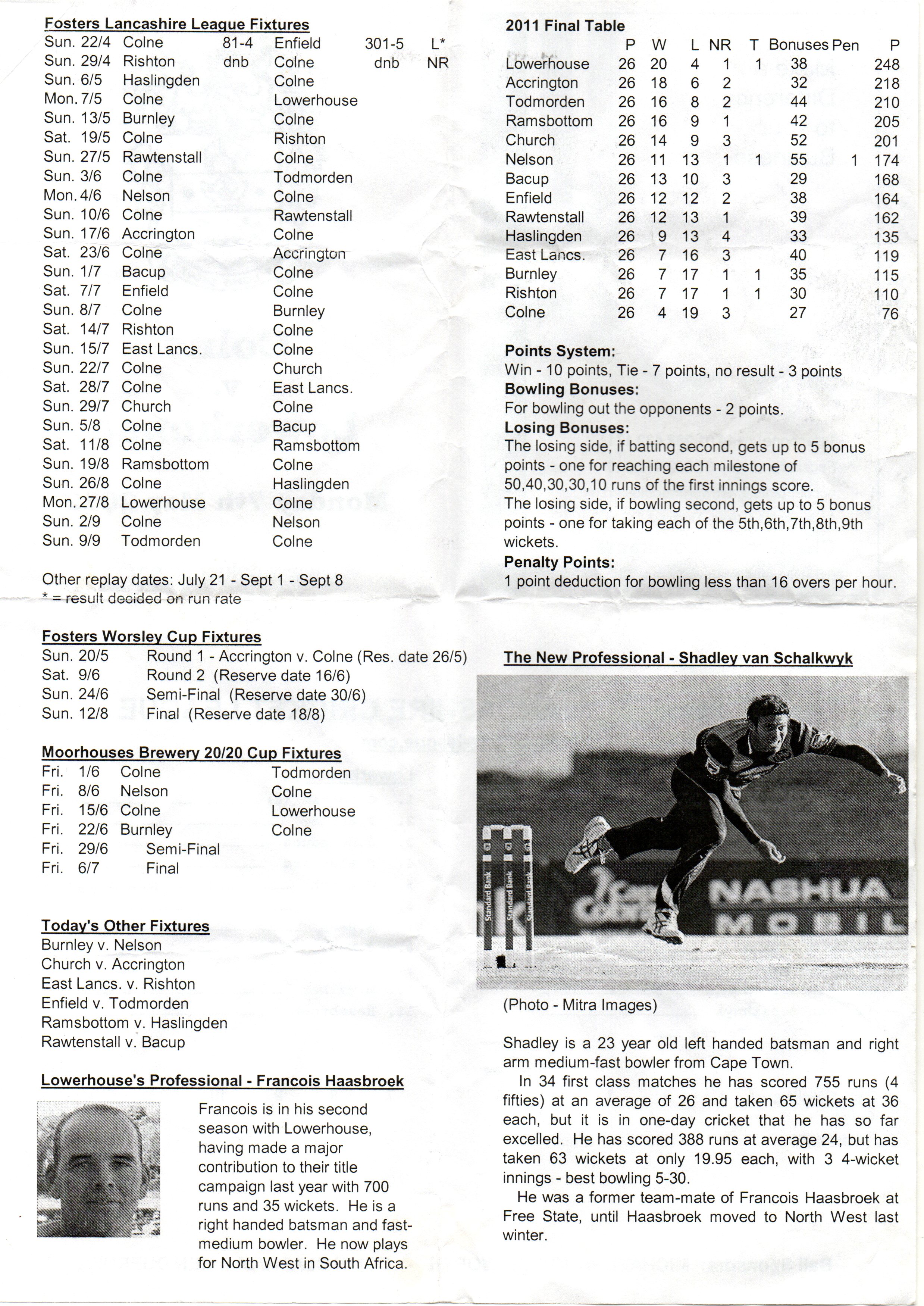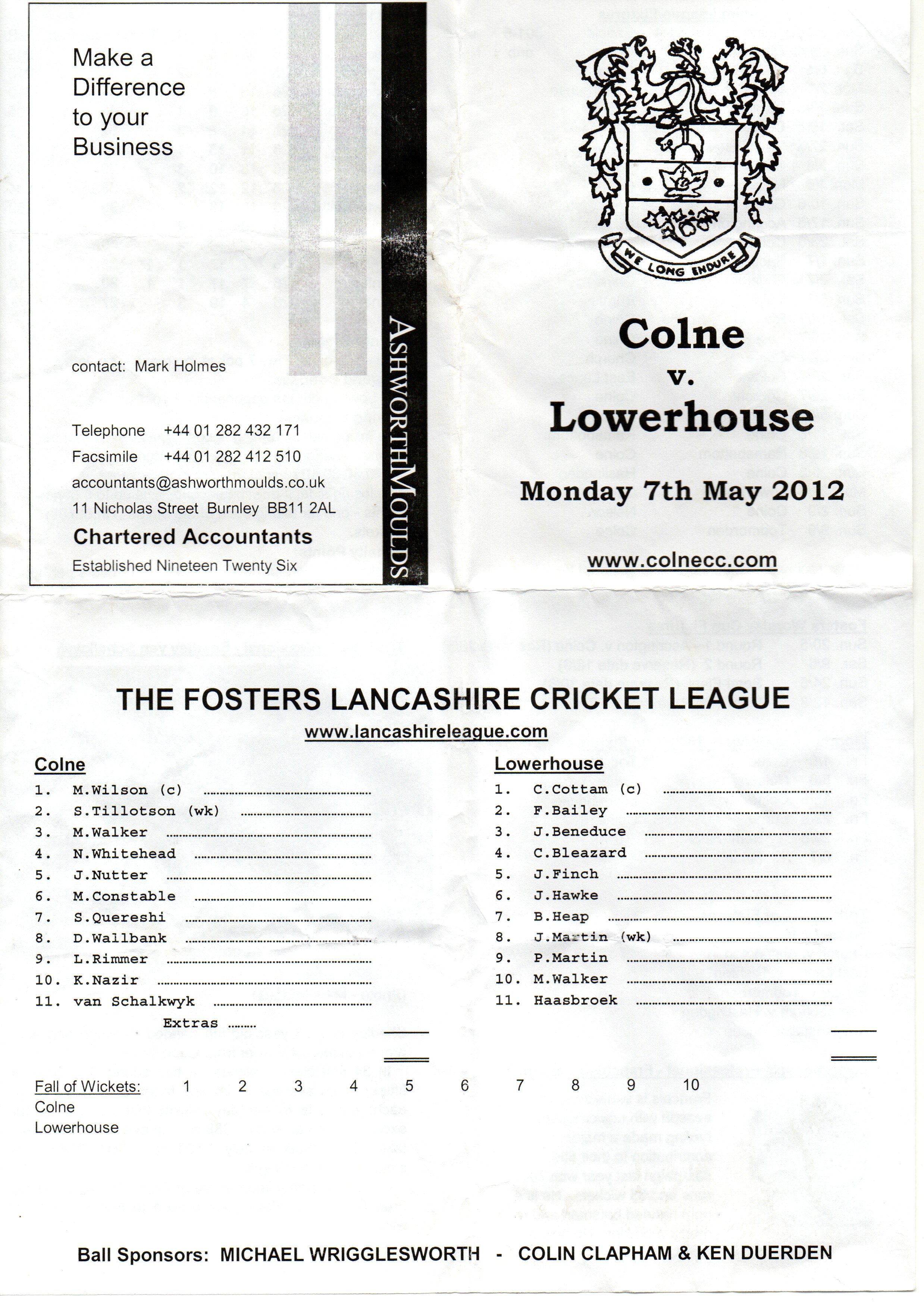 Colne v Lowerhouse Lancashire League At Colne Cricket Club On 7th May 2012 pre-match scorecard |