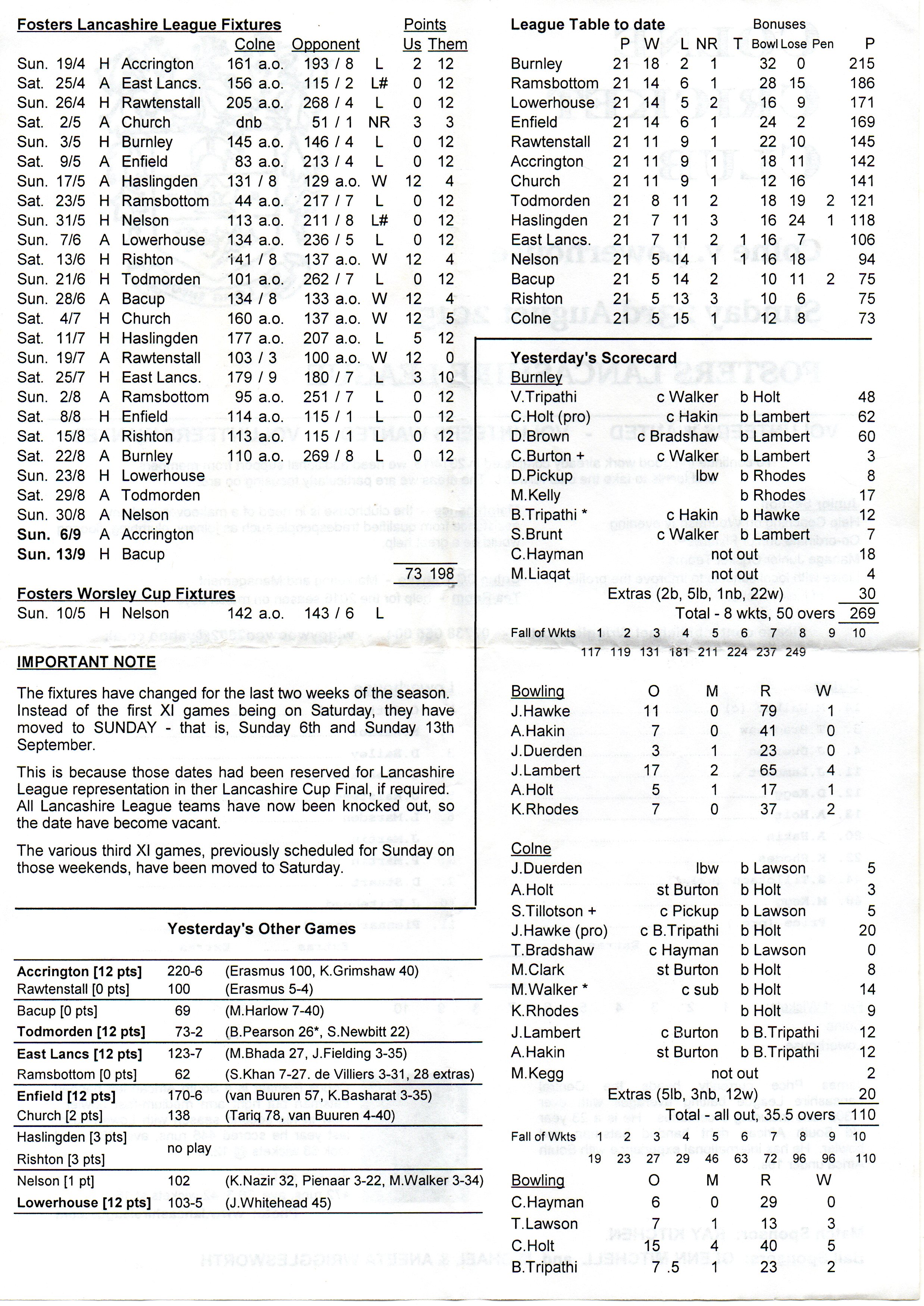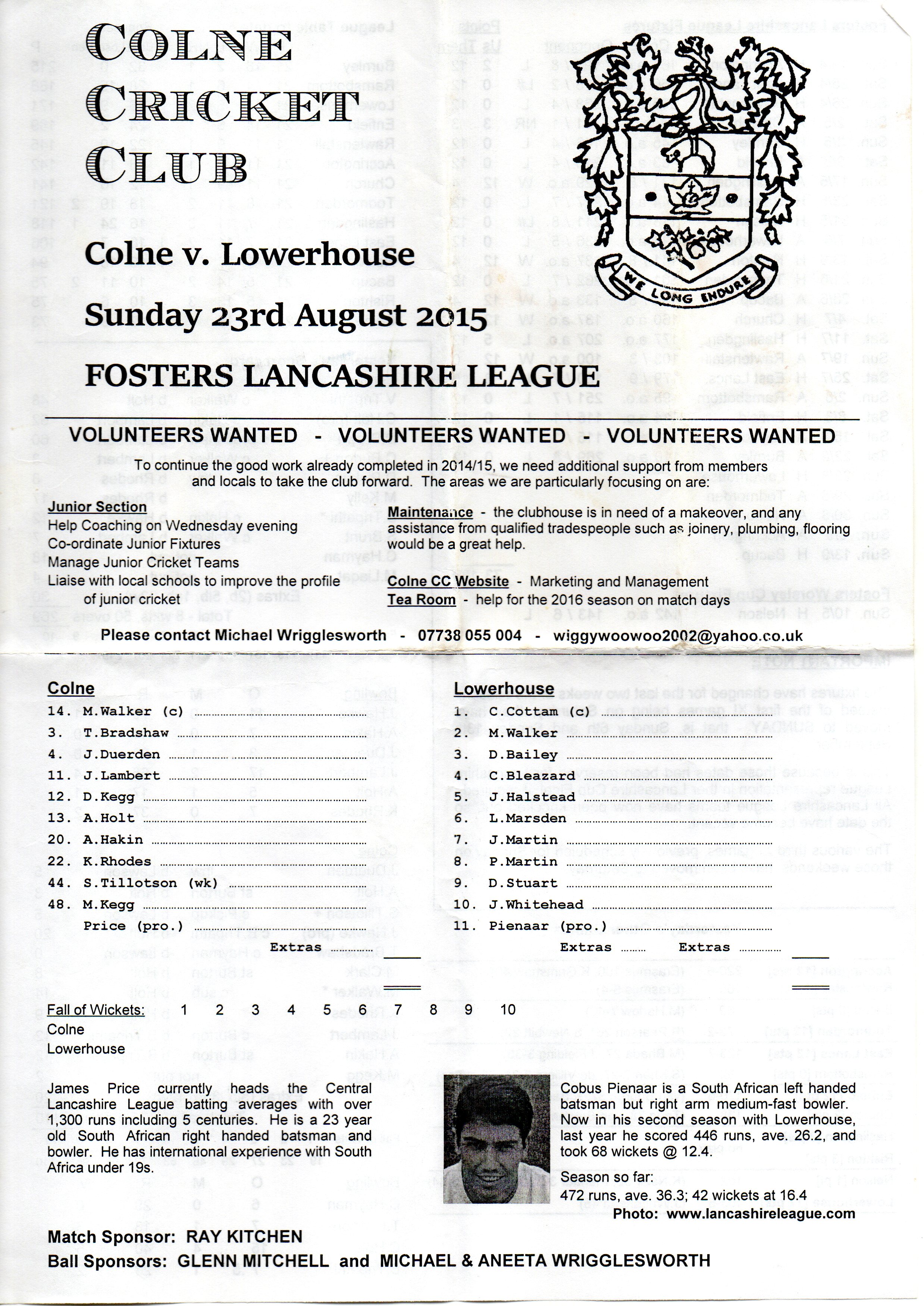 Colne v Lowerhouse Lancashire League At Colne Cricket Club On 23rd August 2015 pre-match scorecard |