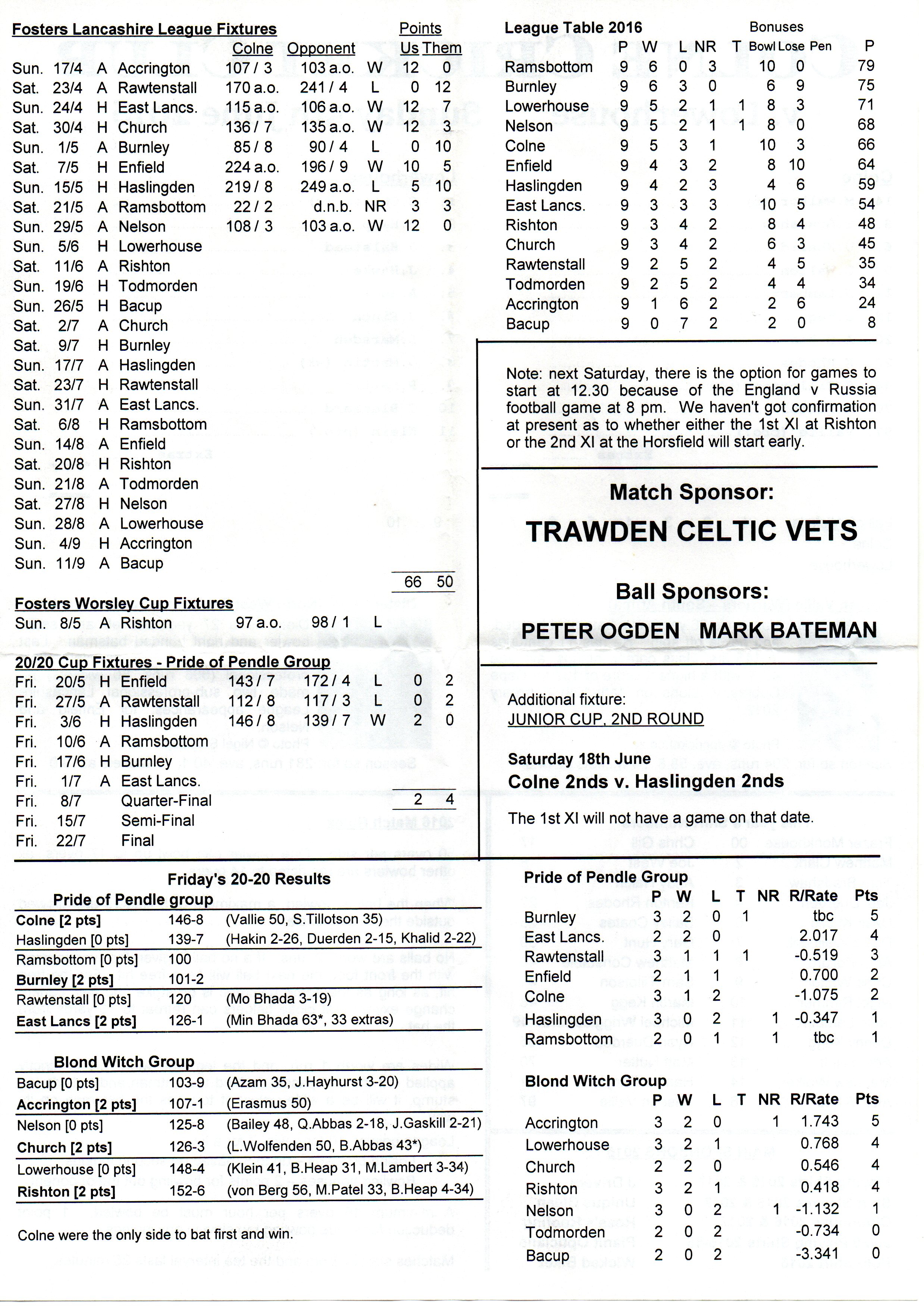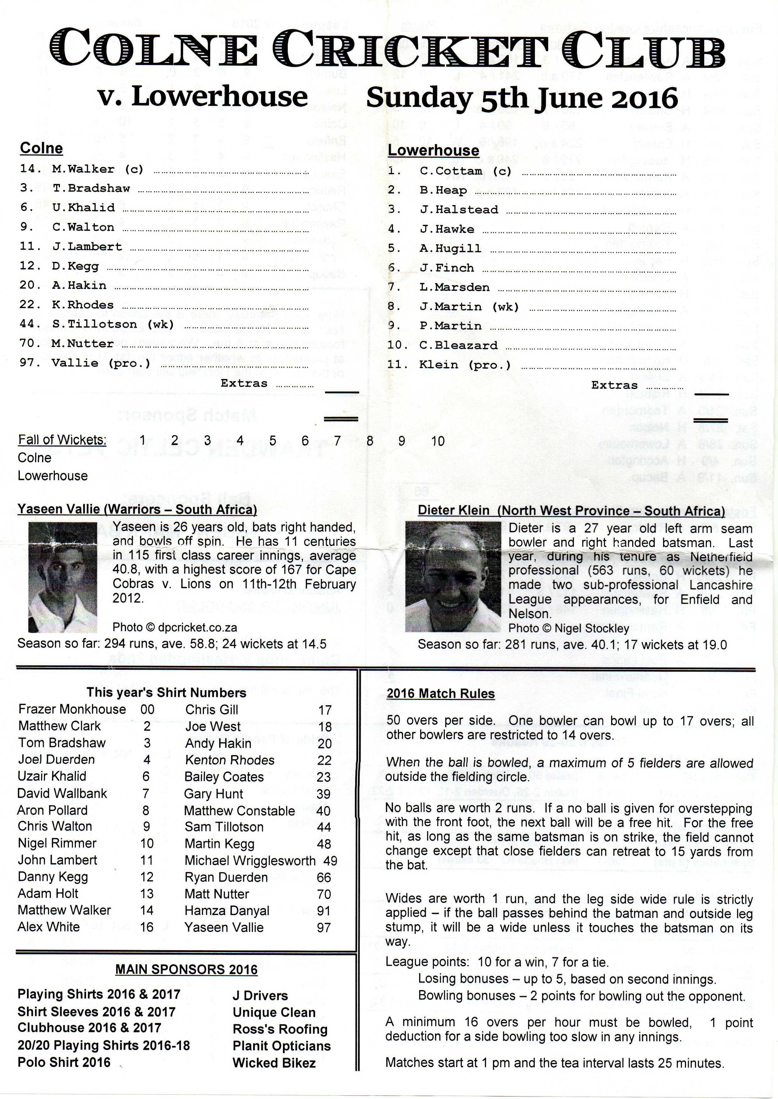 Colne v Lowerhouse Lancashire League At Colne Cricket Club On 5th June 2016 pre-match scorecard |