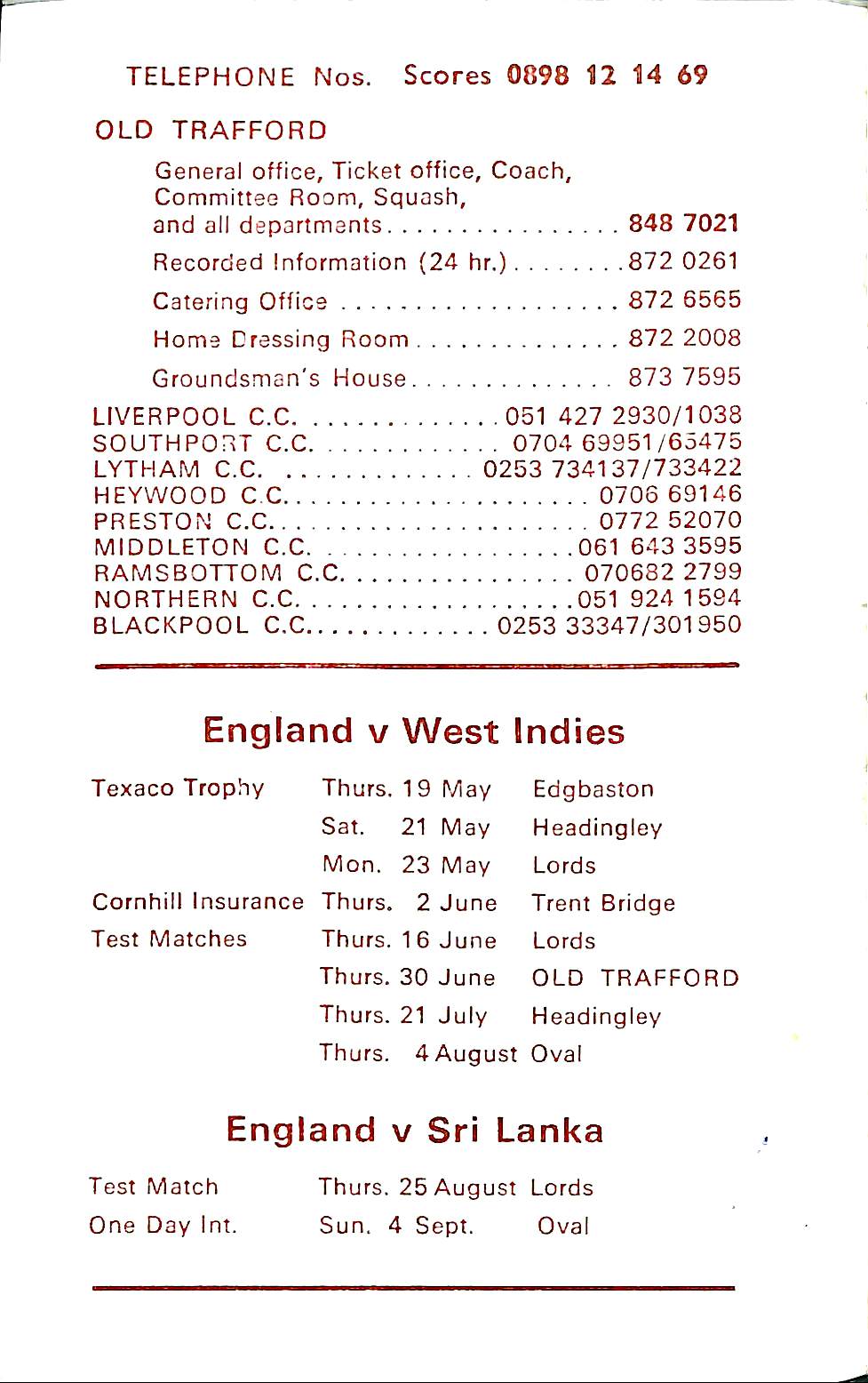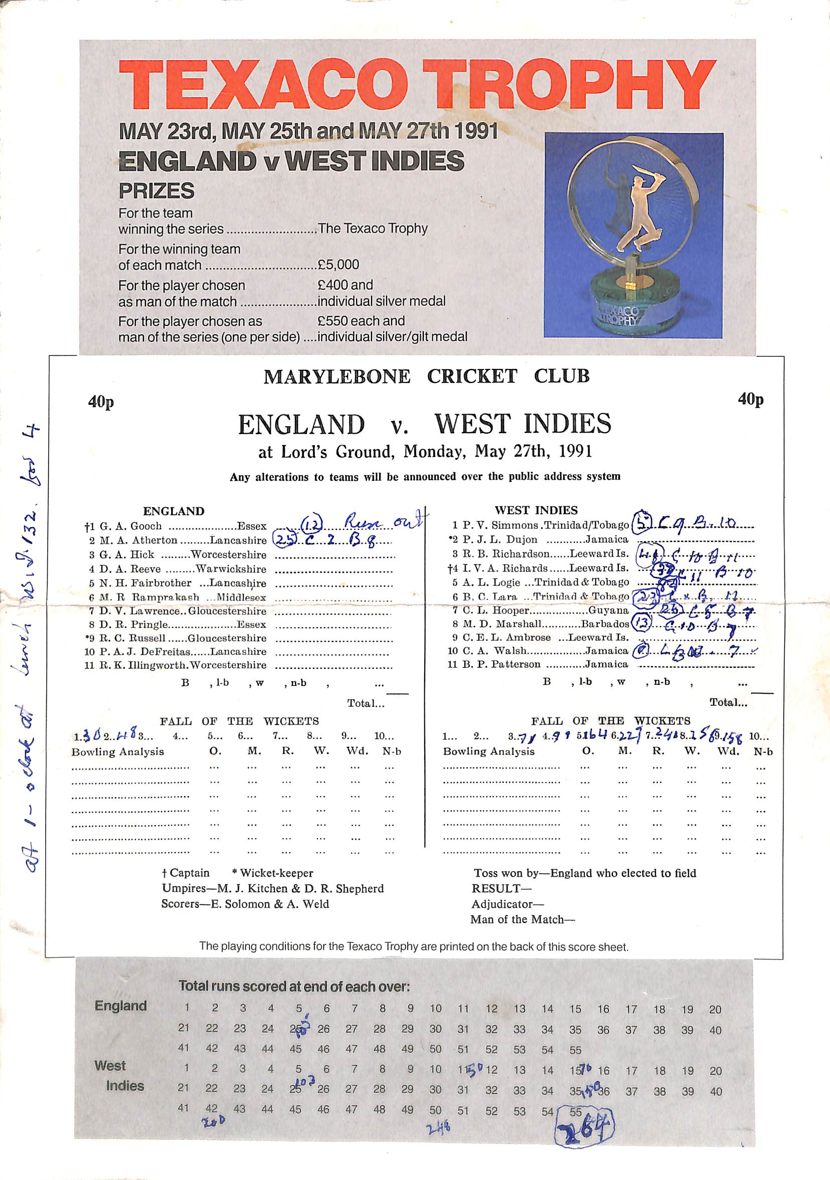 England v West Indies Texaco Trophy At Lord's On 27th May 1991 pre-match scorecard with written updates |