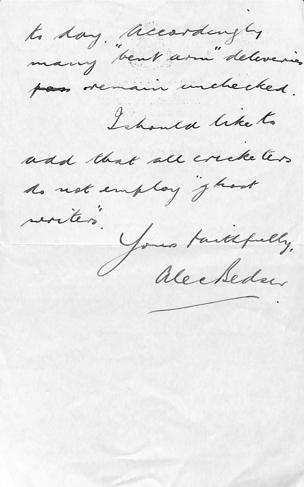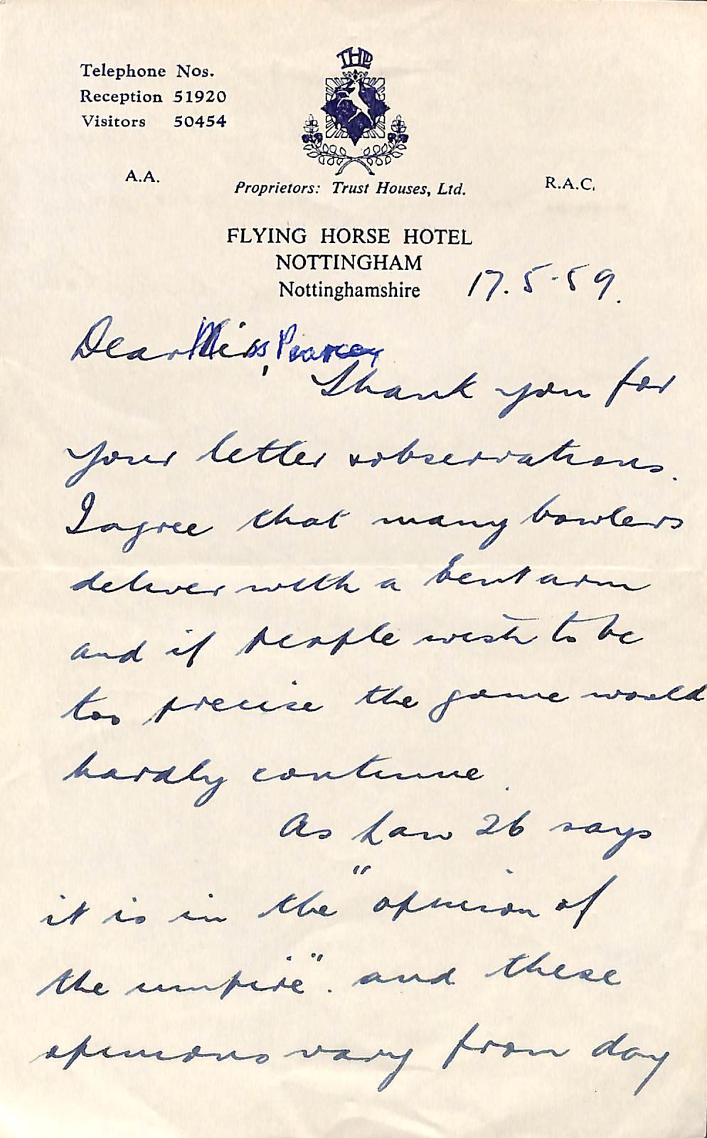 From Alec Bedser To Miss Pearcey On 17th May 1959 Permission to re-use parts of the letter are granted provided the rights of the current owner and this website are acknowledged. |