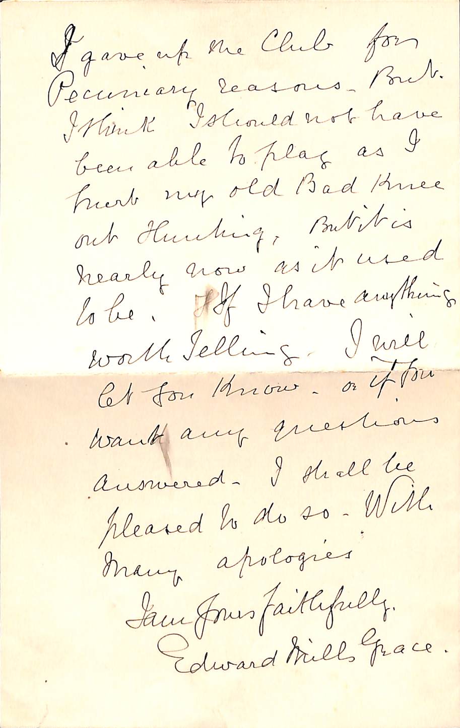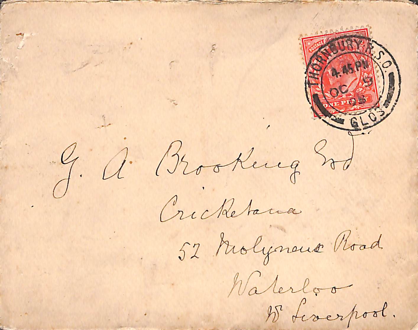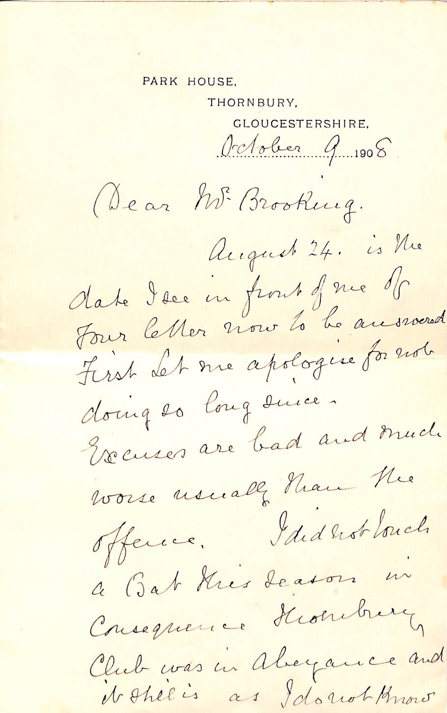From E M Grace To G A Brooking On 9th October 1908 Permission to re-use parts of the letter are granted provided the rights of the current owner and this website are acknowledged. |