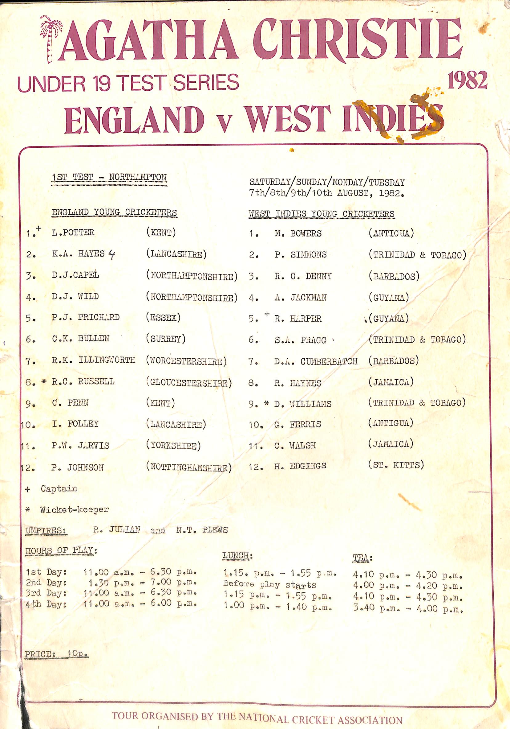 England Under-19s v West Indies Under-19s Under-19 Test Series At Northampton On 7th August 1982 pre-match scorecard |