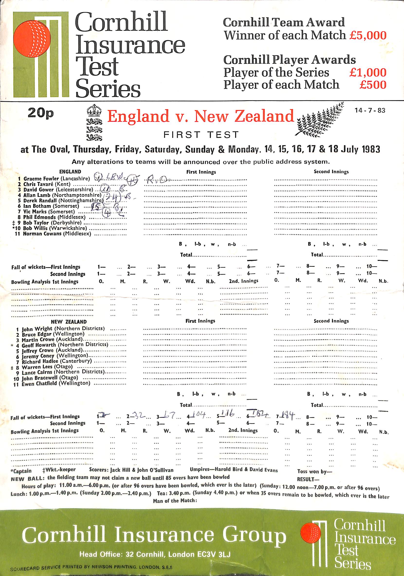England v New Zealand Cornhill Insurance Test Series At The Oval On 14th July 1983 pre-match scorecard with written updates |