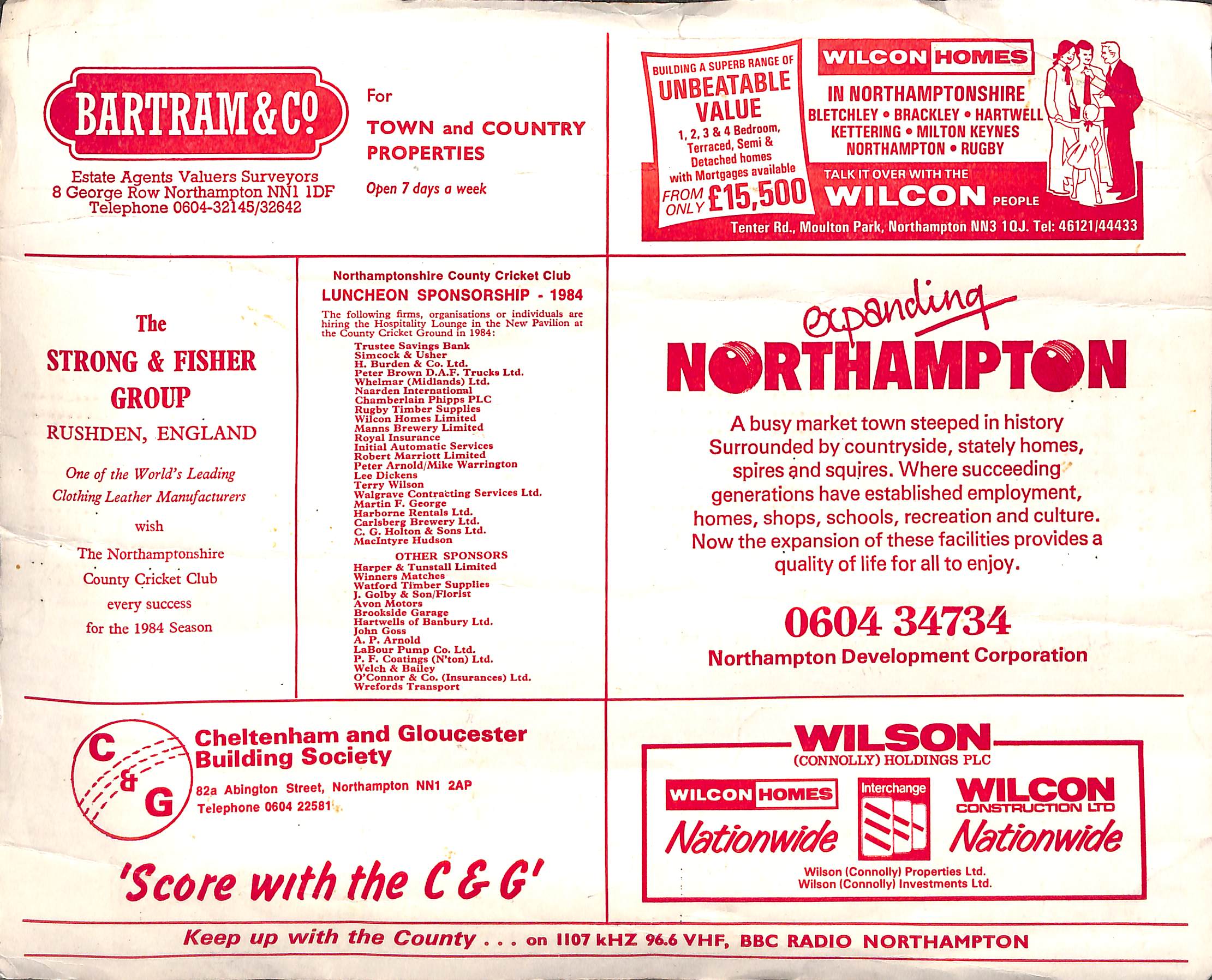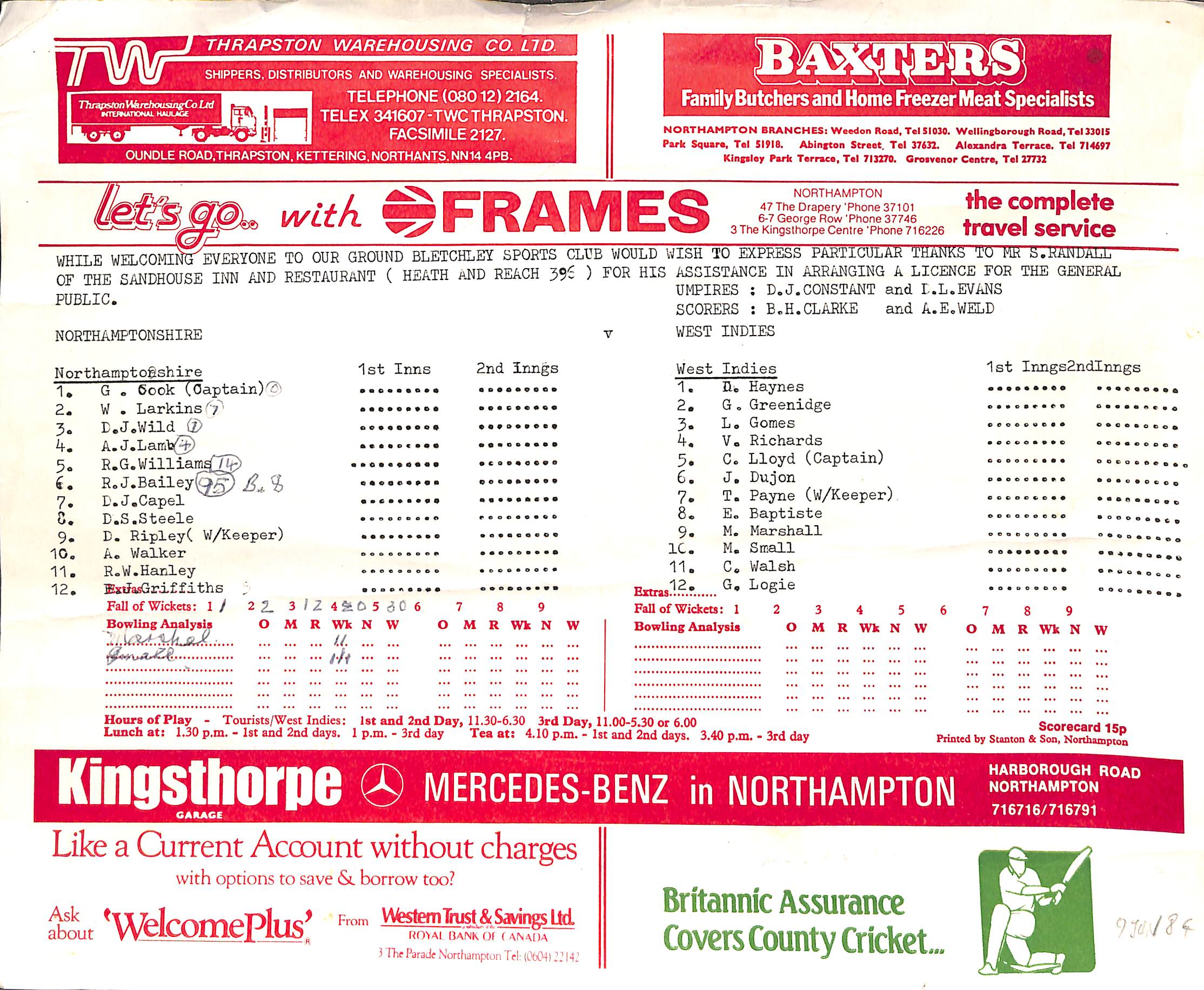 Northamptonshire v West Indies Tour Match At Bletchley Sports Club On 9th June 1984 pre-match scorecard with written updates |