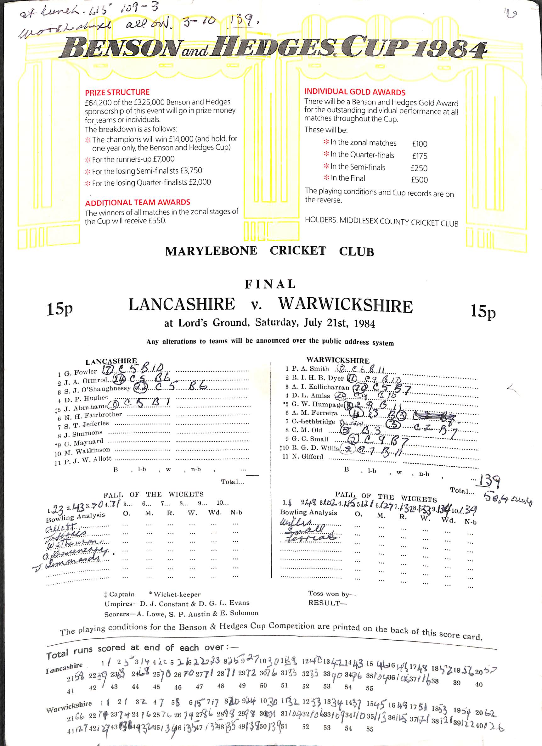 Lancashire v Warwickshire Benson and Hedges Cup At Lord's On 21st July 1984 pre-match scorecard with written updates Final |