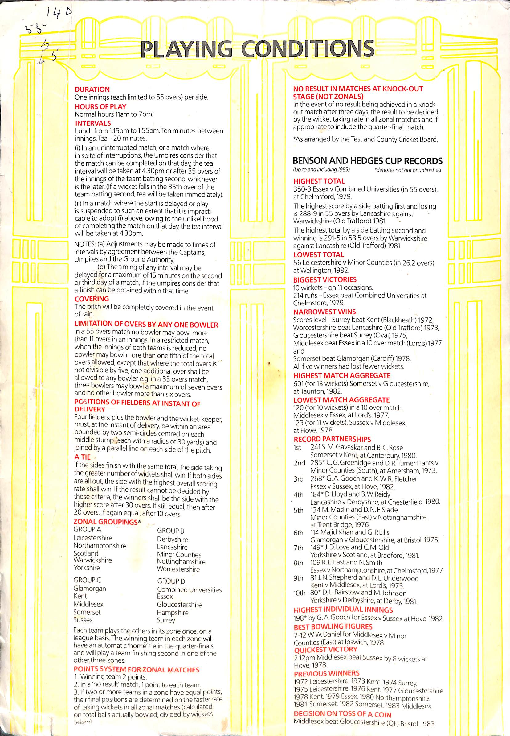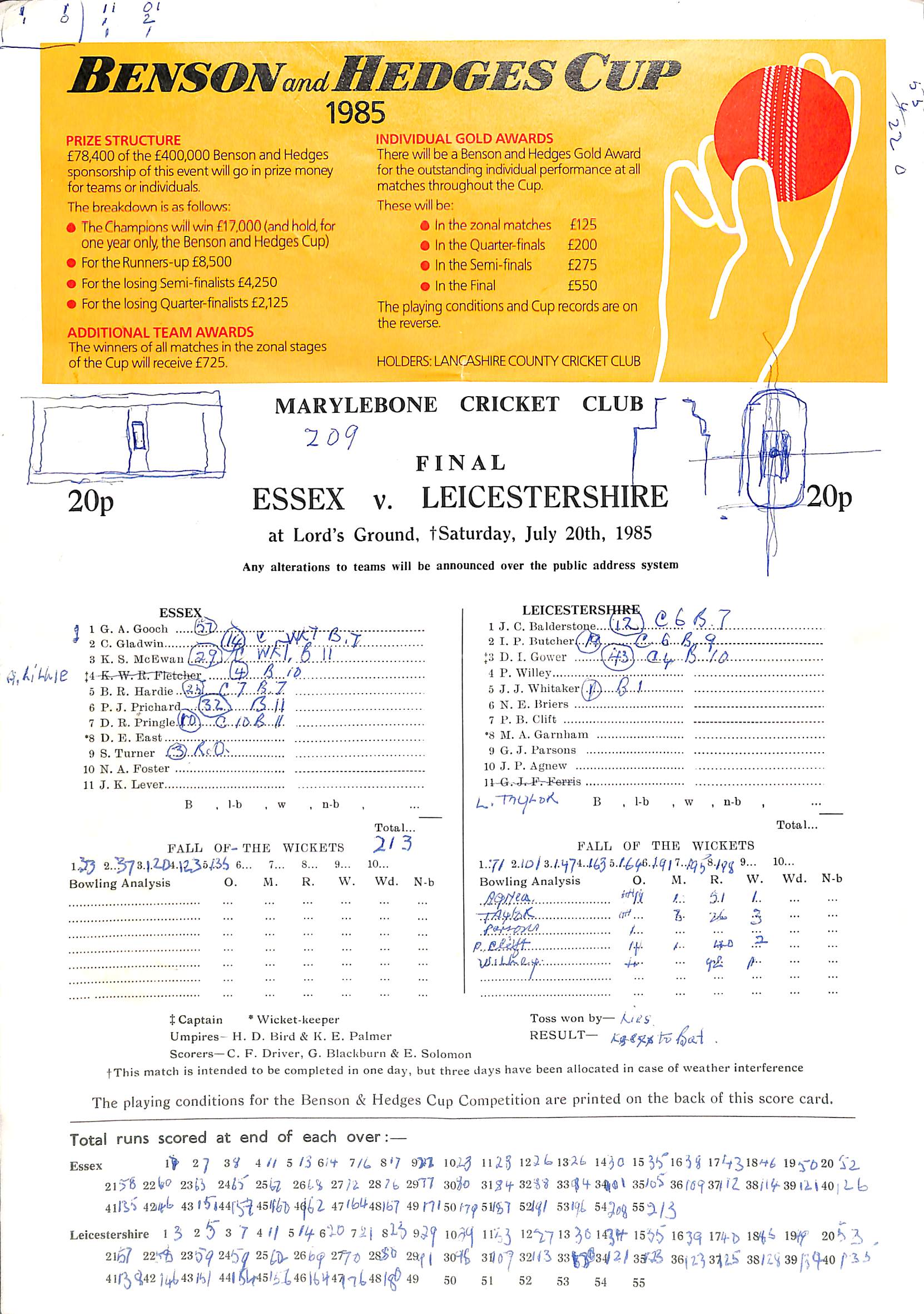 Essex v Leicestershire Benson and Hedges Cup At Lord's On 20th July 1985 pre-match scorecard with written updates Final |