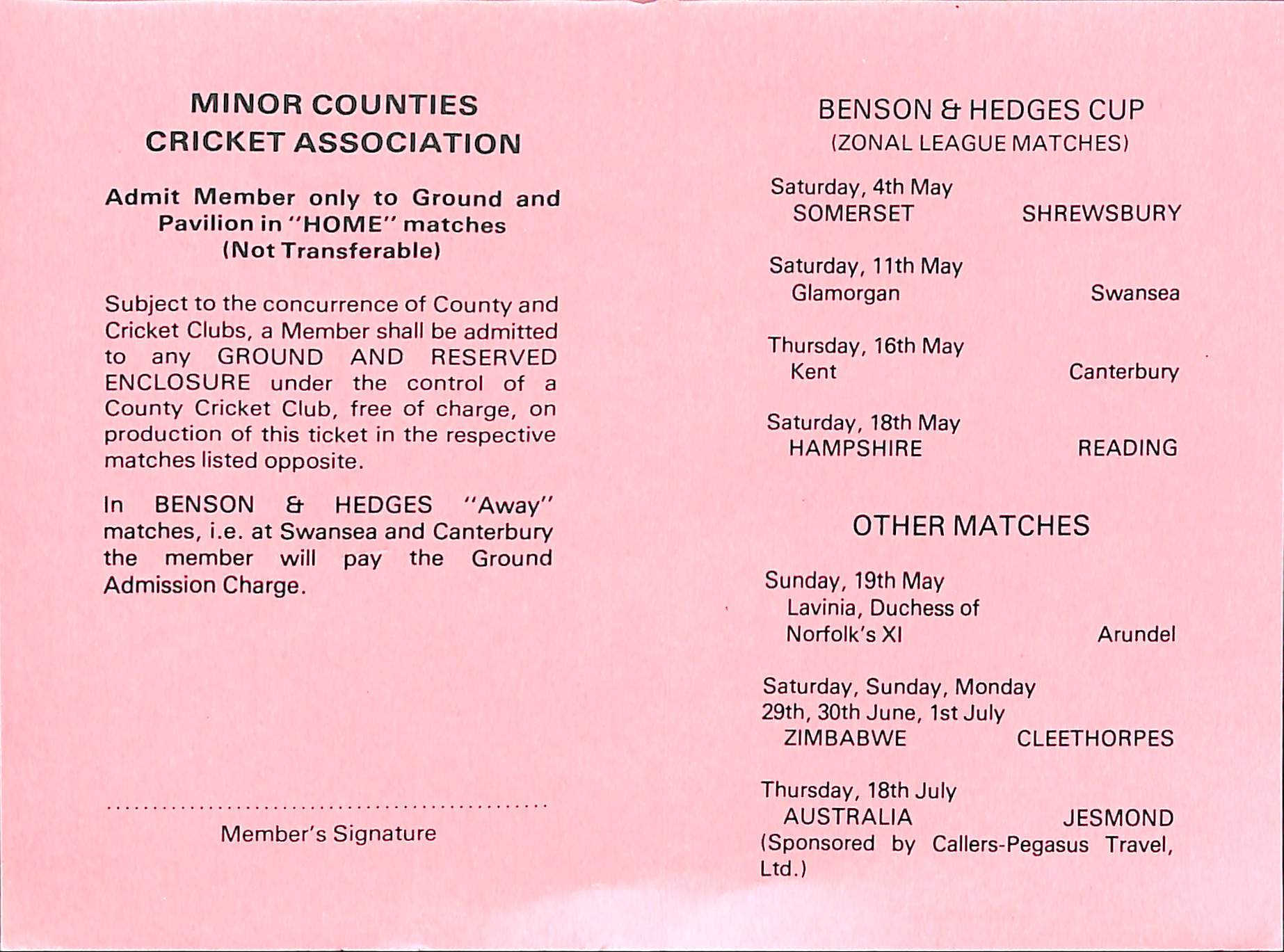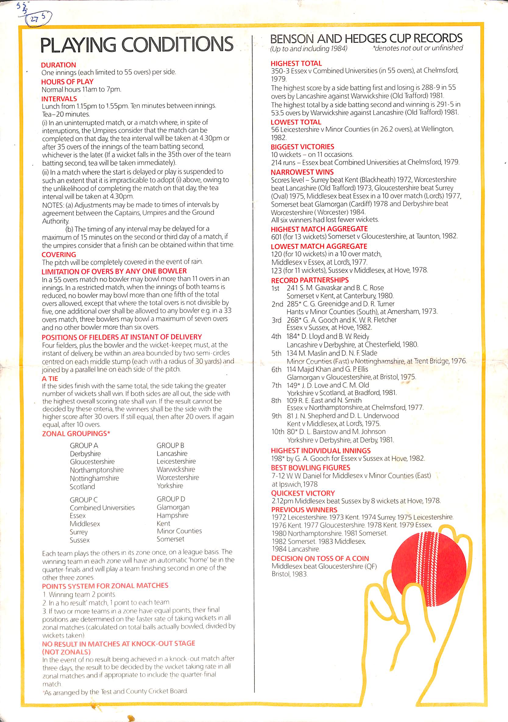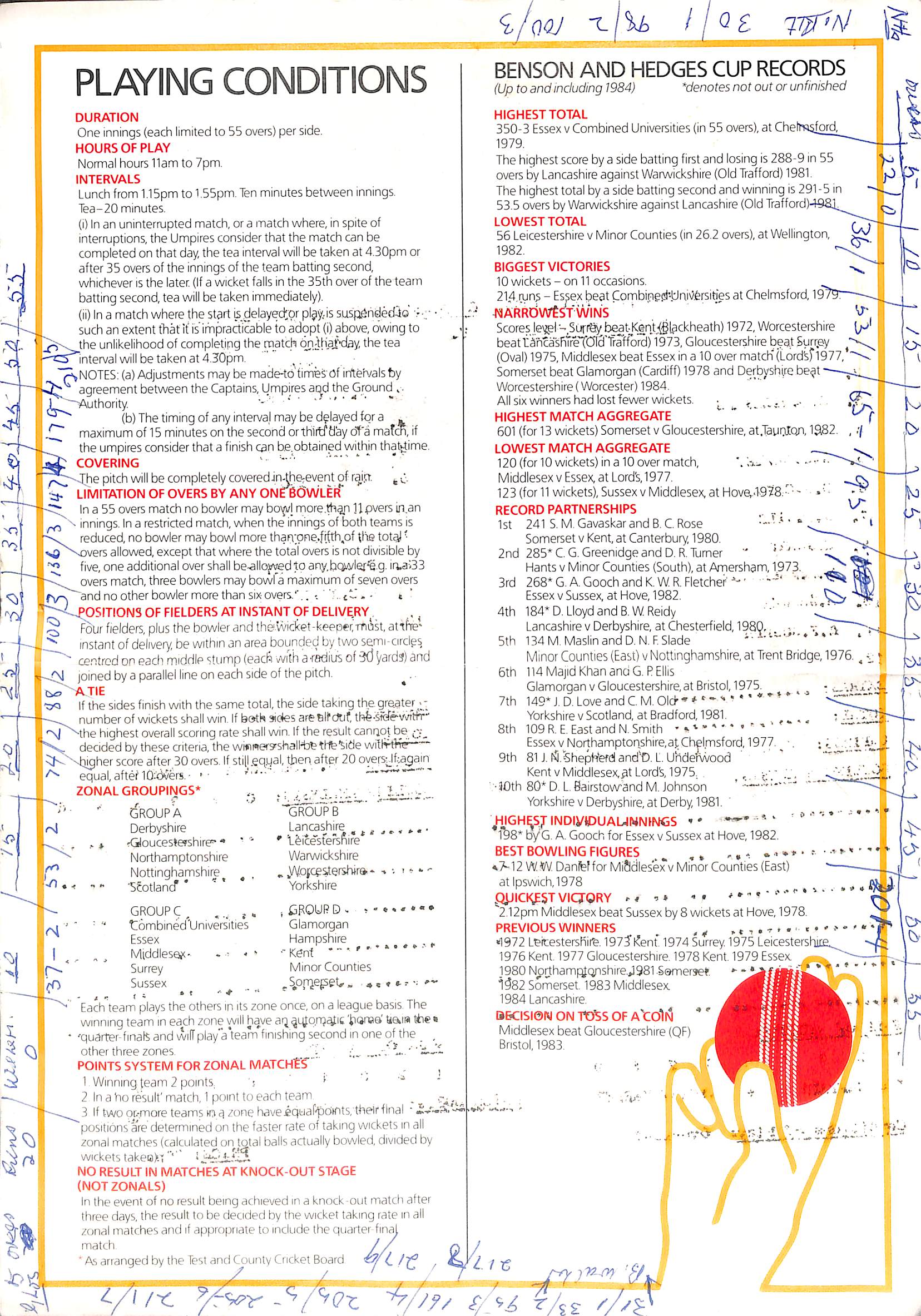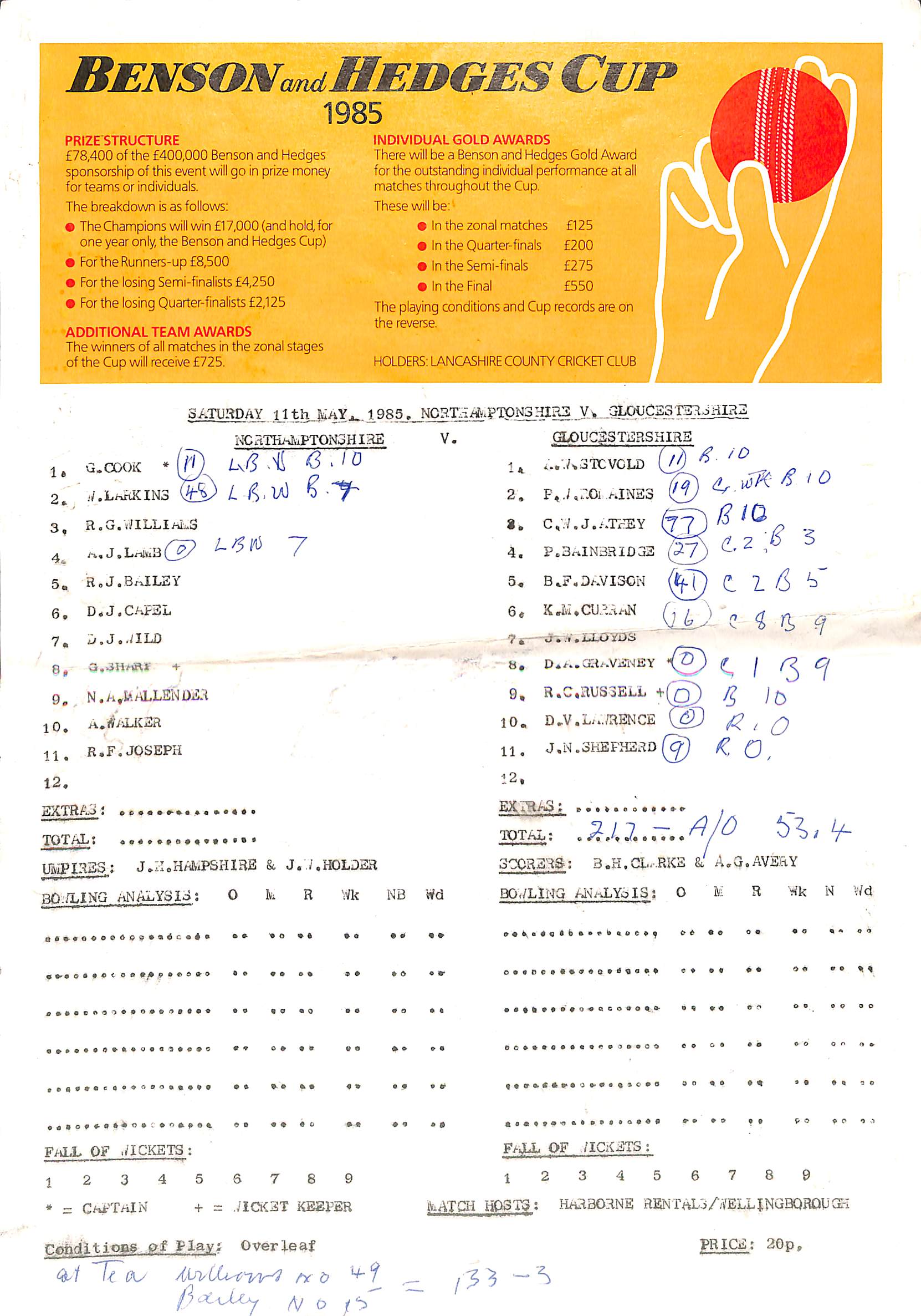 Northamptonshire v Gloucestershire Benson and Hedges Cup At Northampton On 11th May 1985 pre-match scorecard with written updates |