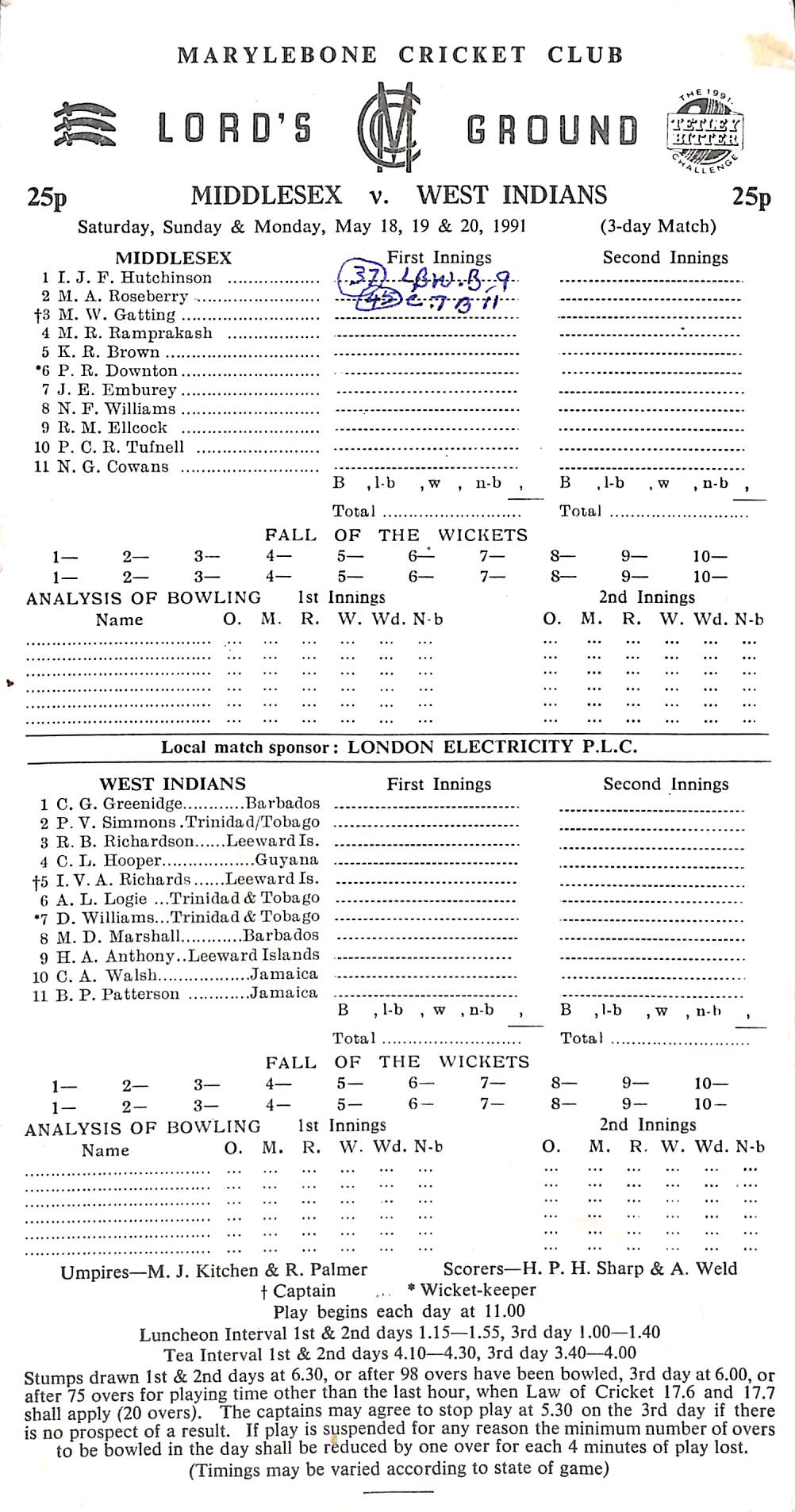 Middlesex v West Indians Tour Match At Lord's On 18th May 1991 pre-match scorecard with written updates |